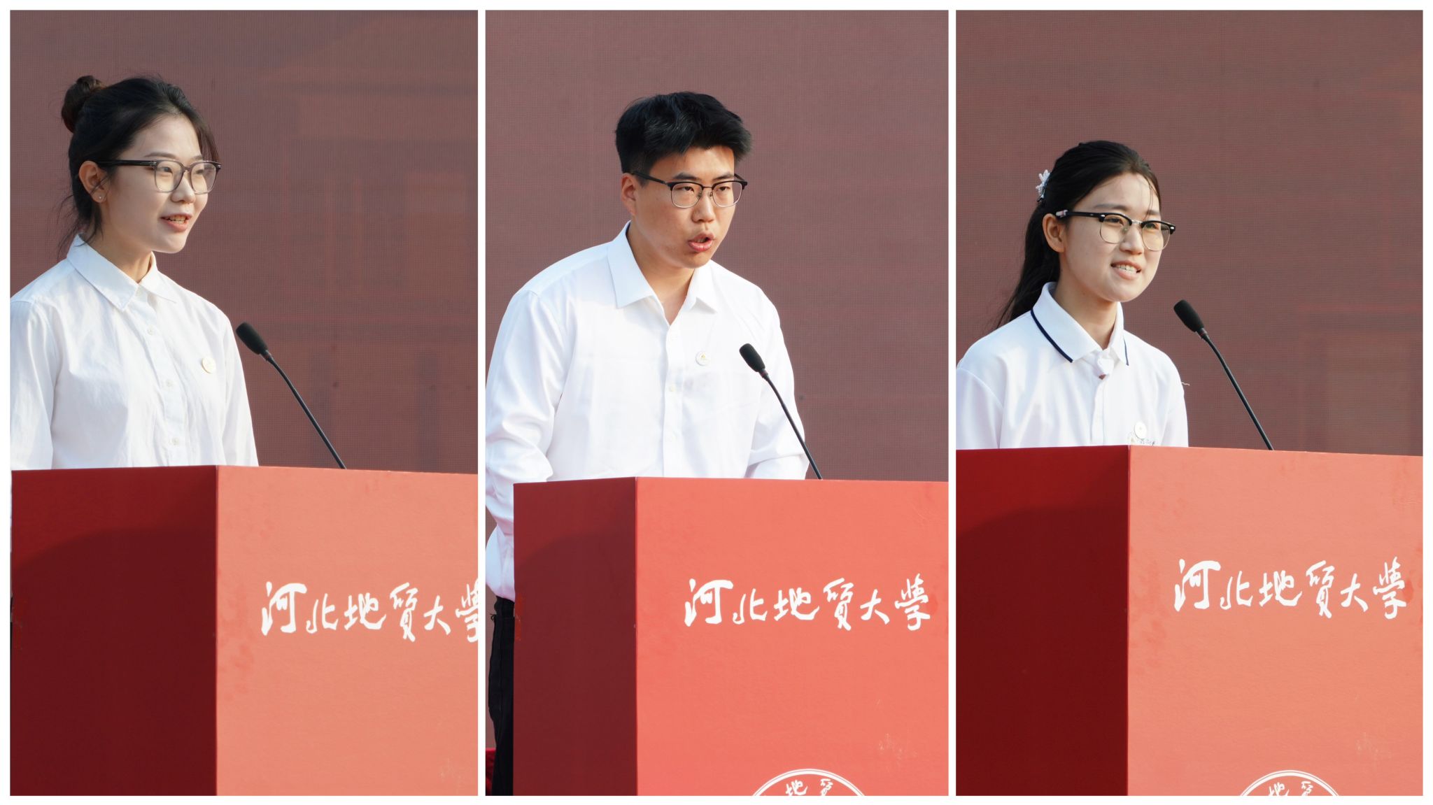 在校生代表刘朔彤、研究生新生代表龚星硕、本科新生代表马伊轲分别发言,从不同角度表达了对大学生活的憧憬、对学术理想的追求以及对“地大人”身份的认同与自豪。