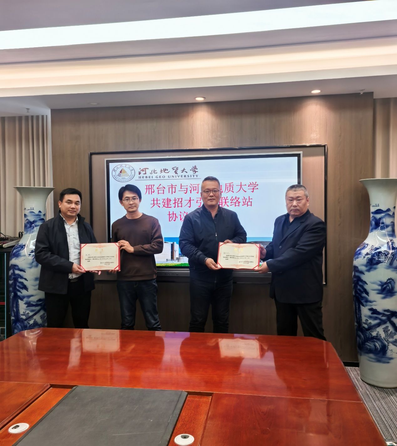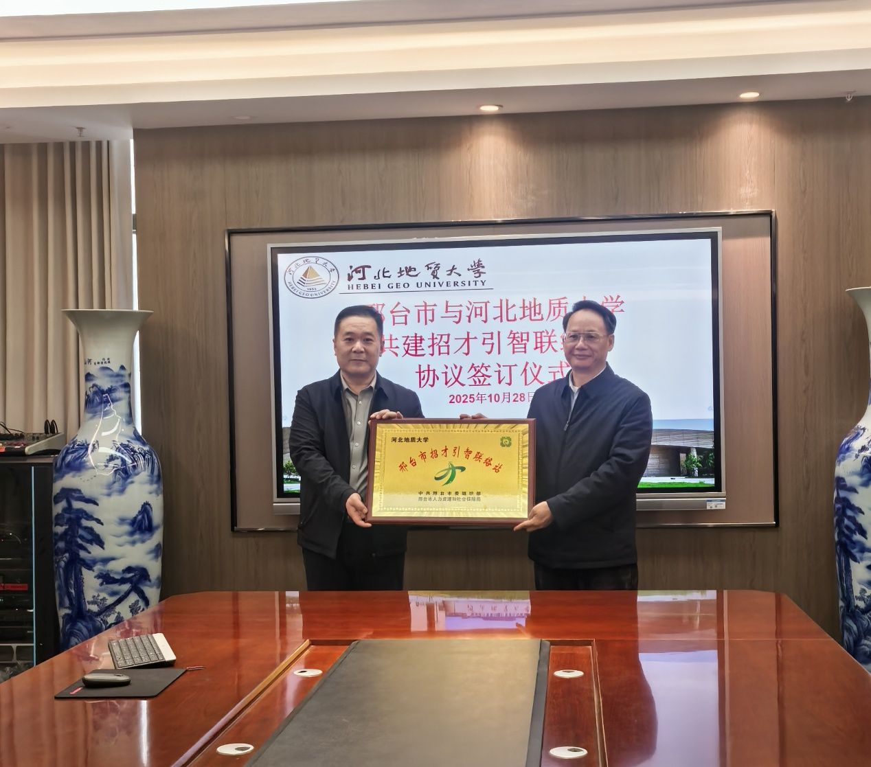 10月28日下午,受邢台市人民政府委托,邢台市人力资源和社会保障局一行赴beat365在线唯一官网登录就邢台市与beat365官网共建校地招才引智联络站举行签约与授牌活动。学校党委副书记王彦东,邢台市人社局党组成员、副局长黄国平出席。