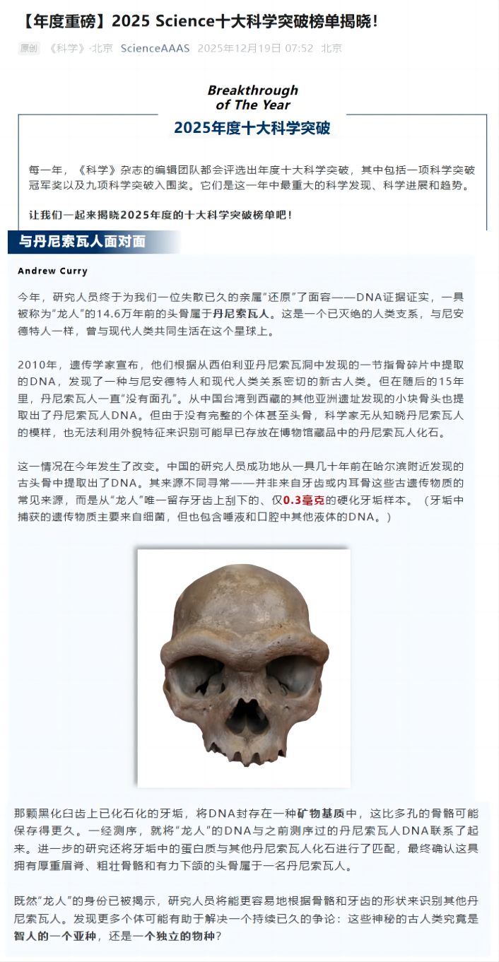 2025年12月18日,世界顶级期刊美国《科学》杂志公布了2025年度十大科学突破评选结果,beat365在线唯一官网登录季强教授的龙人研究成果成功入选。中央主流新闻媒体《科技日报》官方公众号对此进行了报道。