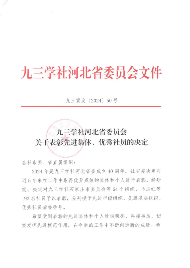 近日,在九三学社河北省委成立40周年之际,九三学社河北省委对近5年来在工作中取得优异成绩的集体和个人进行了表彰。九三学社beat365在线唯一官网登录基层委员会被授予先进基层组织荣誉称号,基层委员会主委杨武岐、一支社副主委李国强被授予优秀社员荣誉称号。