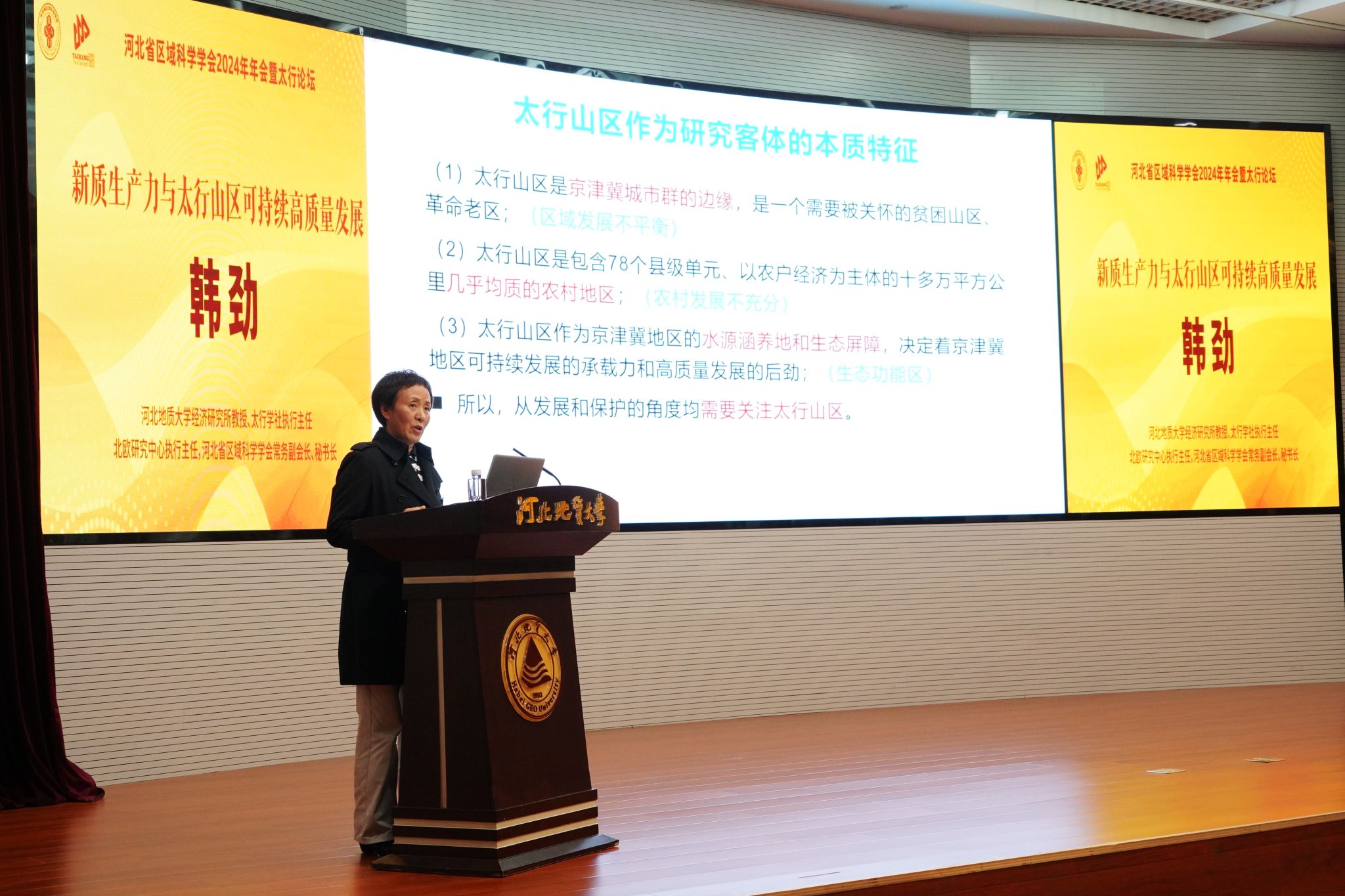 韩劲发表题为《新质生产力与太行山区可持续高质量发展》的主旨演讲。她指出,太行山区是京津冀城市群边缘的一个需要被关怀的贫困山区、革命老区,建设京津冀世界级城市群,需要太行山区生态、经济、社会综合有效治理。她提出了“太行生态创富模型”,即在京津冀协同发展战略背景下,在习近平“绿水青山就是金山银山”理论指导下,立足太行山区作为京津冀城市群的生态涵养功能区和相对贫困的农村地区现状,贯彻新发展理念,构建区域发展新格局,抽象出的可持续高质量发展新模式。