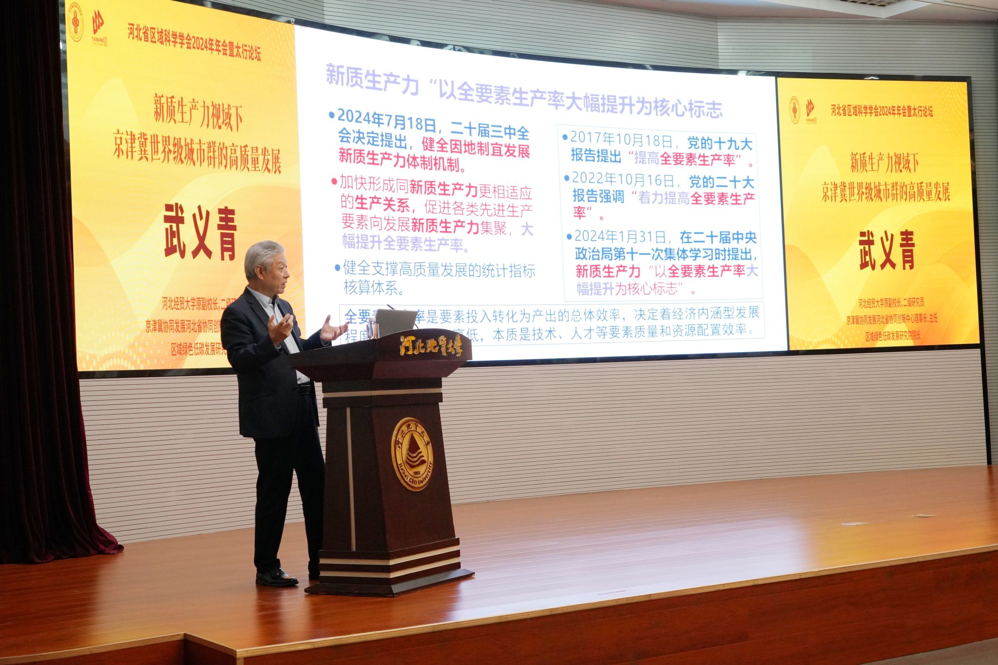 武义青发表题为《新质生产力视域下京津冀世界级城市群的高质量发展》的主旨演讲。他的研究发现,京津冀协同发展以来,京津冀城市群13个地级以上城市全要素生产率(TFP)呈不同程度的上升趋势。为推动经济实现质的有效提升和量的合理增长,他建议把全要素生产率纳入新质生产力绩效评估指标体系,对地方及各类功能区全要素生产率进行统计核算与监测,并作为对地方及功能区考核的重要依据,引导地方经济高质量发展。