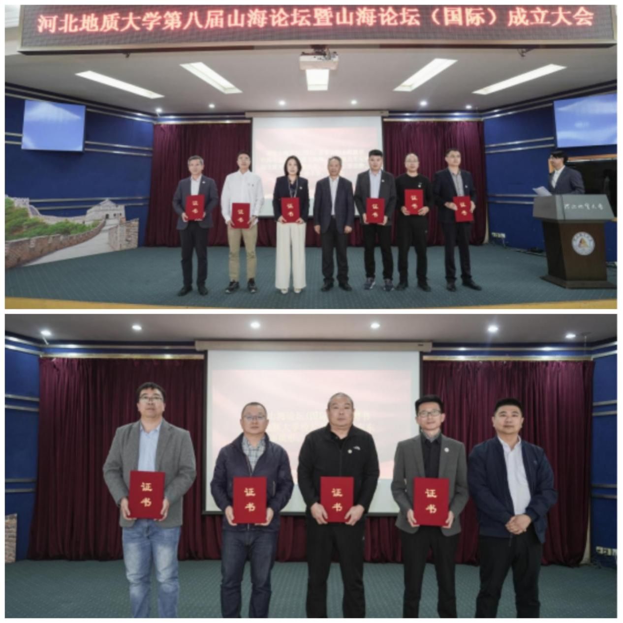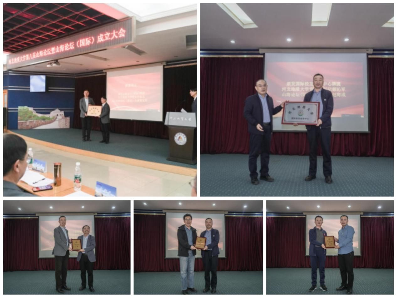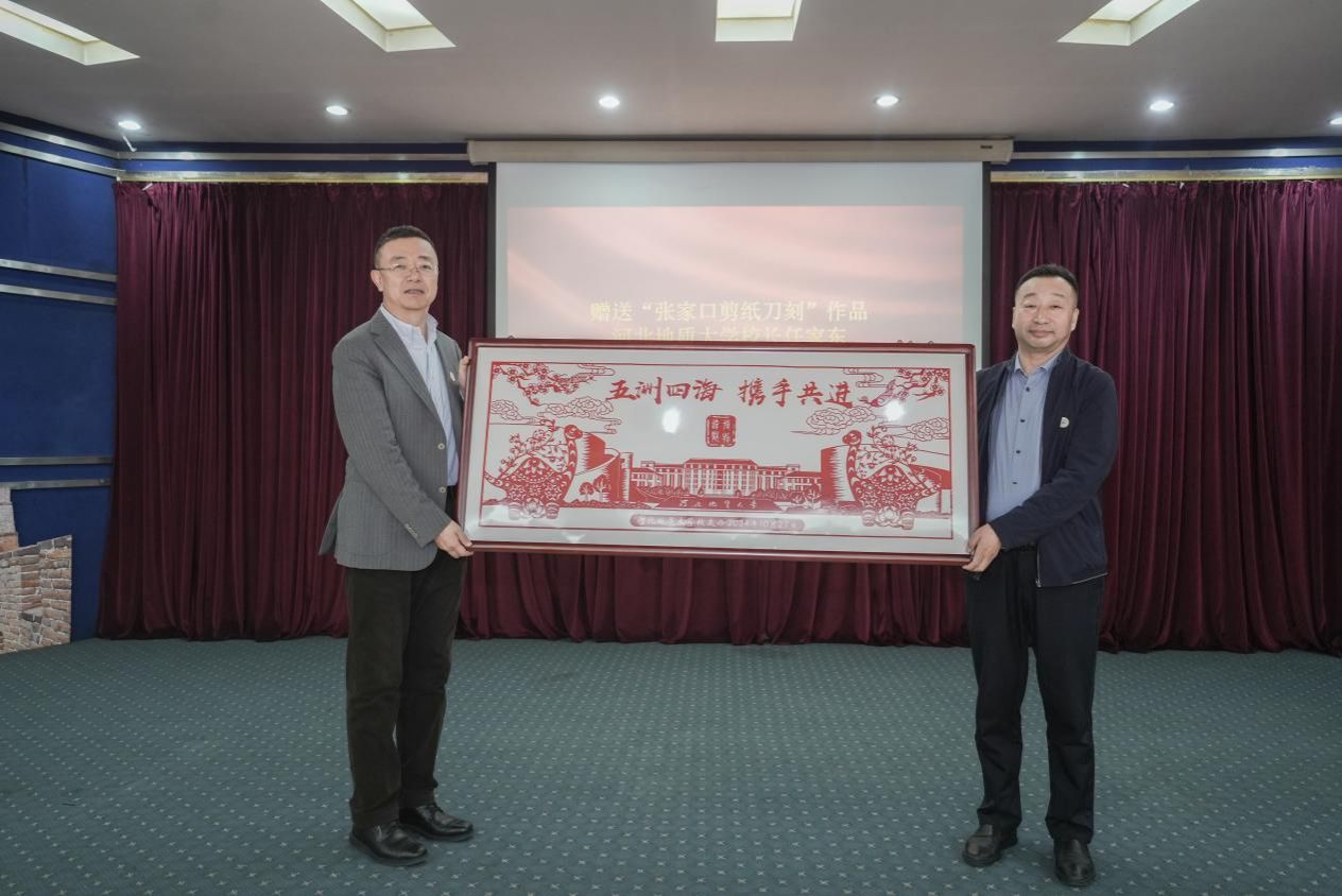 与会校领导为山海论坛(国际)的理事会成员颁发聘书、授牌,并赠送了“张家口剪纸刀刻”作品。
