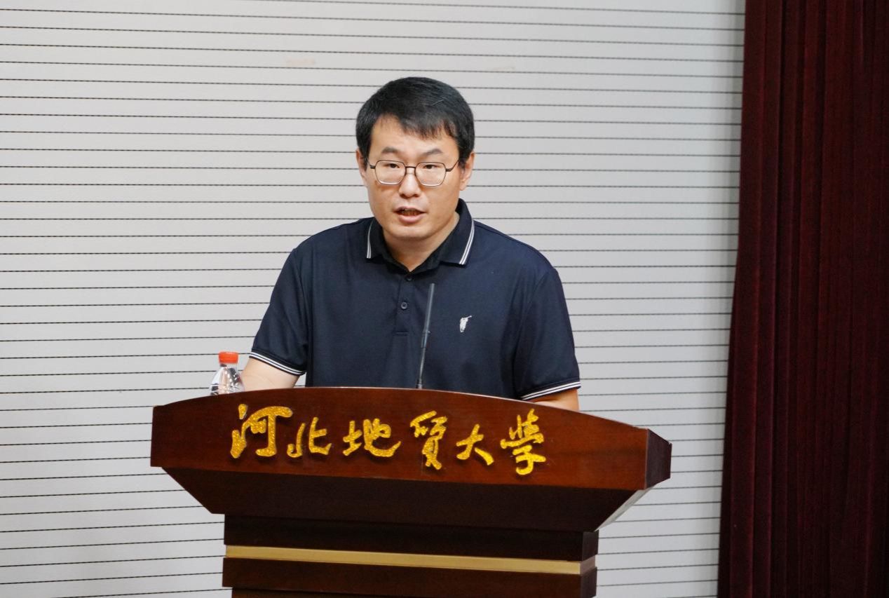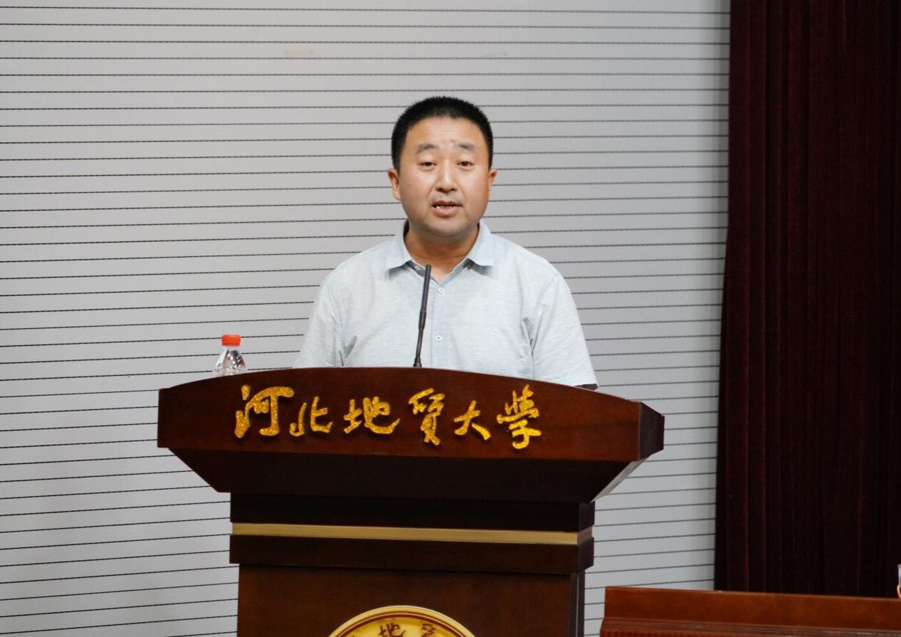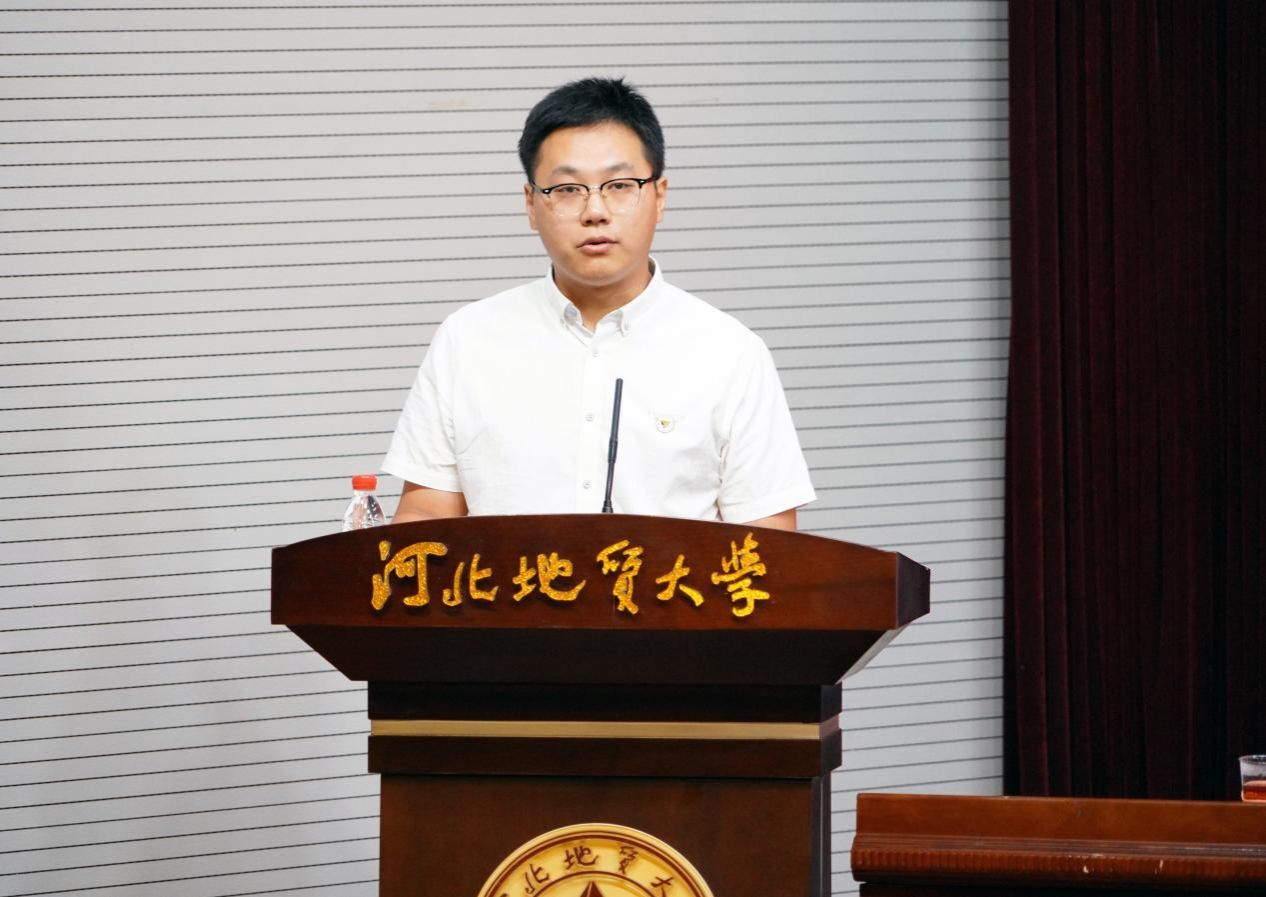 新入职教师代表袁世冲老师发言,他说,作为新教师,我们将以“崇道弘德”为己任,以“经世致用”为目标,秉承“达观博物”校训,弘扬“仰山慕水”文化,做一名脚踏实地,积极应对,勇于探索,敢于挑战的教书匠,为河北地大更加辉煌灿烂的明天奉献自己的青春和力量。