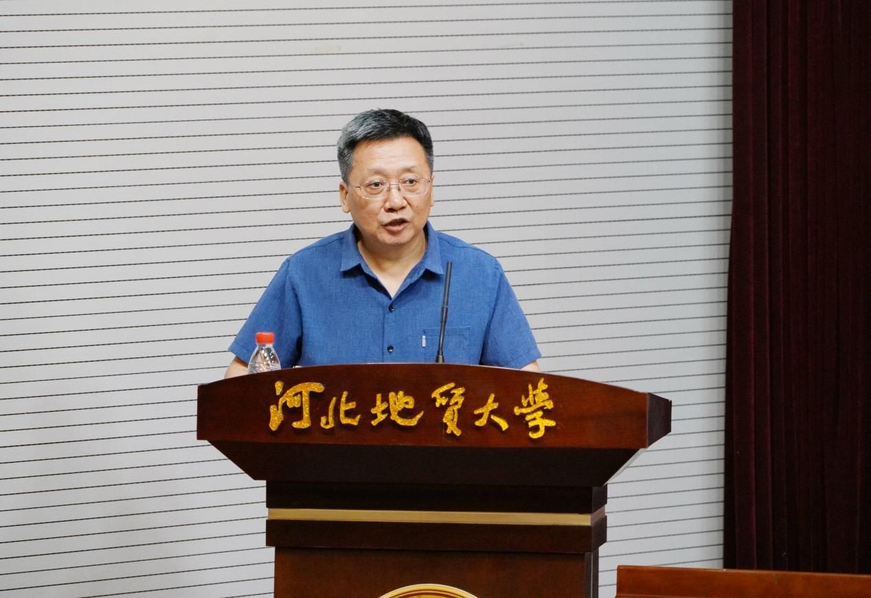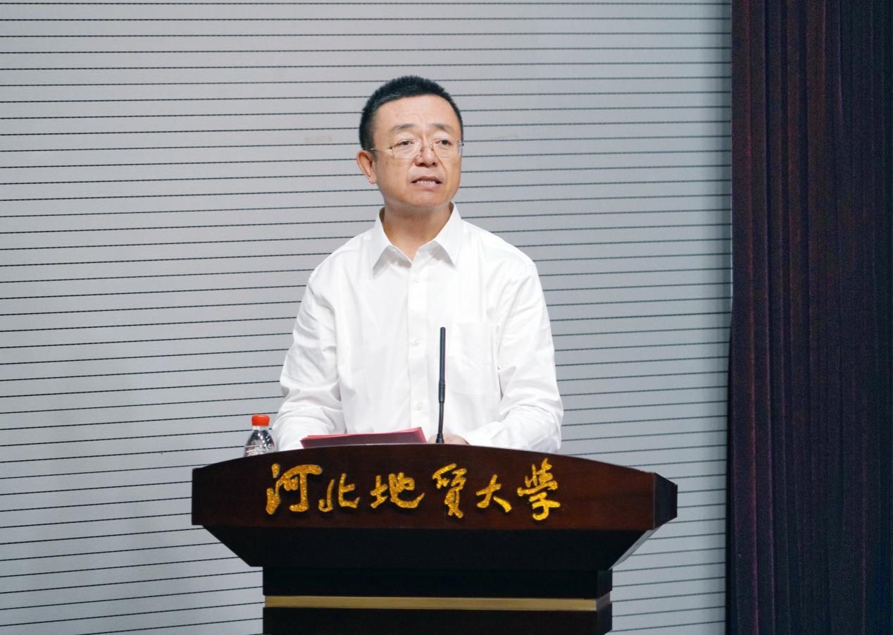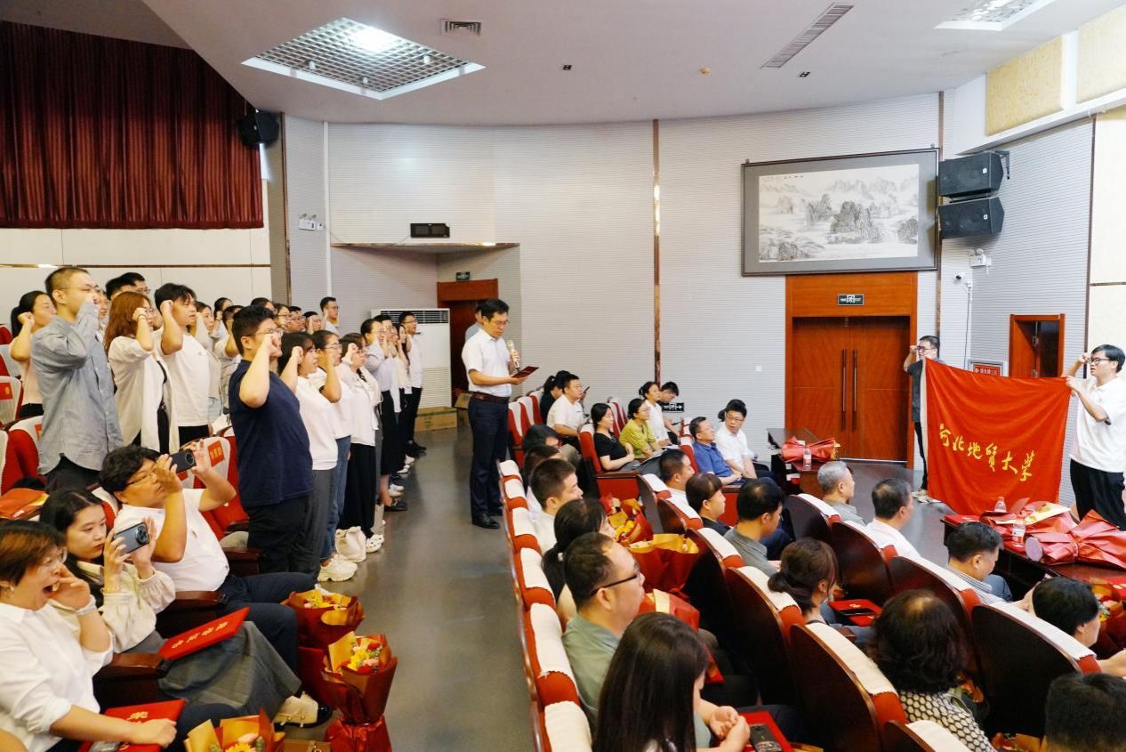 新入职教师代表袁世冲老师发言,他说,作为新教师,我们将以“崇道弘德”为己任,以“经世致用”为目标,秉承“达观博物”校训,弘扬“仰山慕水”文化,做一名脚踏实地,积极应对,勇于探索,敢于挑战的教书匠,为河北地大更加辉煌灿烂的明天奉献自己的青春和力量。