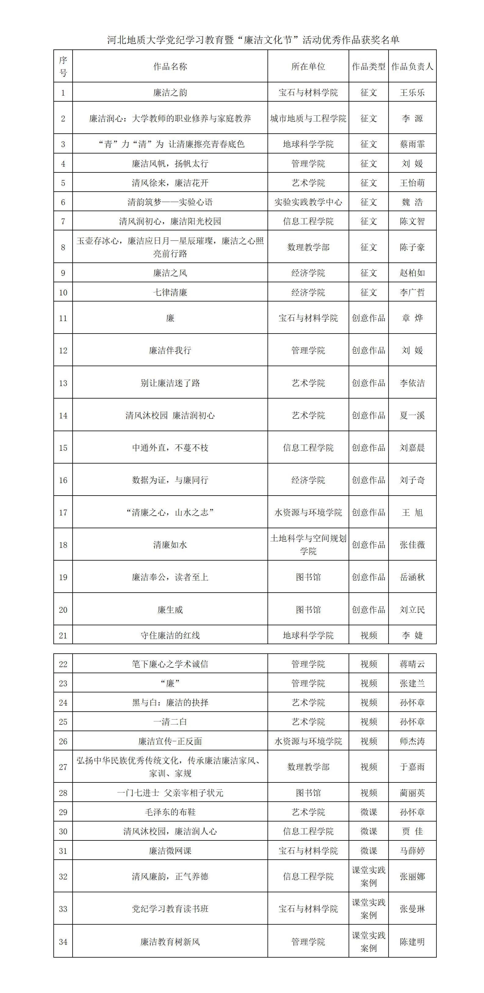 本次活动共有14个单位报送138份作品,其中征文类72篇,视频类20个,创意类43份,案例类3个。经学校评定,管理学院刘媛提交的征文作品《廉洁风帆,扬帆太行》、艺术学院孙怀章提交的视频作品《黑与白:廉洁的抉择》、经济学院刘子奇提交的创意作品《数据为证,与廉同行》、信息工程学院张丽娜提交的课堂实践案例《清风廉韵,正气养德》等34项作品获得优秀奖,艺术学院等14个单位获评优秀组织奖。部分优秀作品已推荐至省委教育工委进行省级评选并上报到教育部。