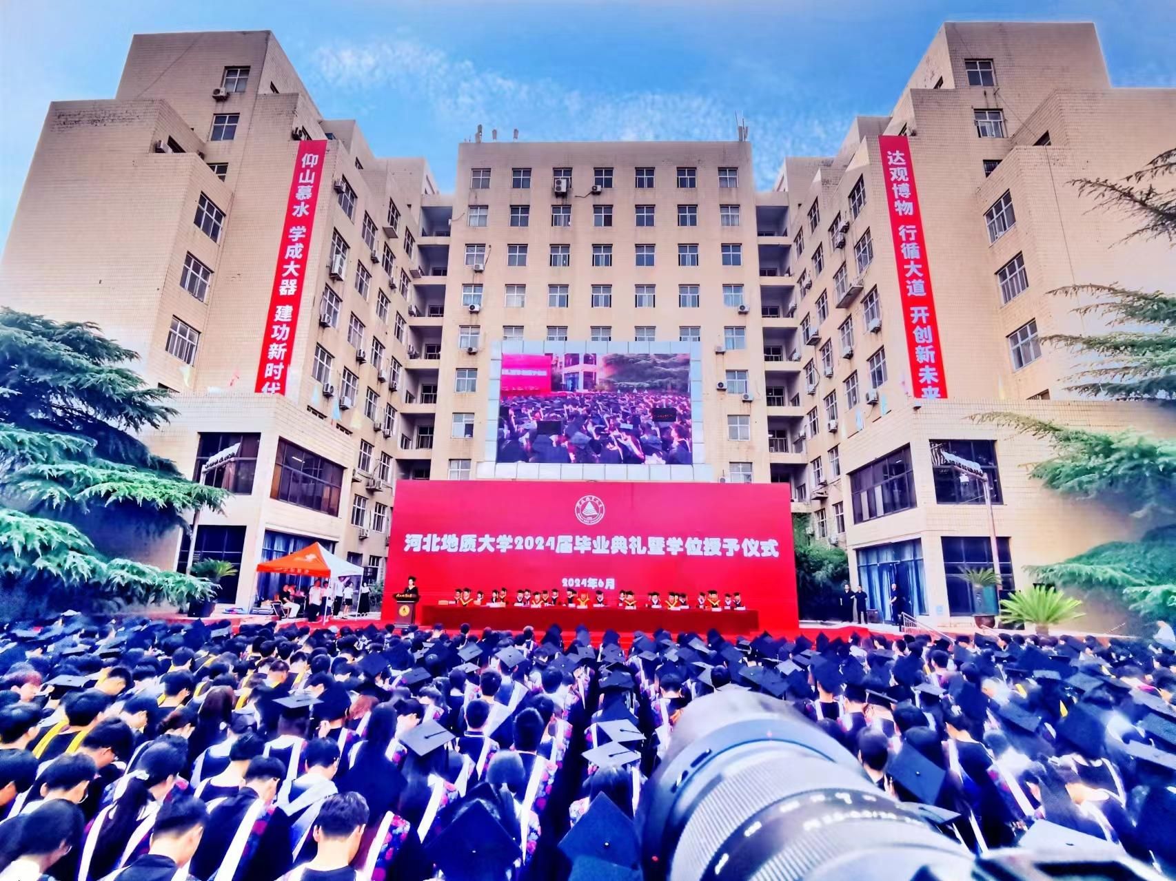 毕业送别照片集、歌曲《孤勇者》《匆匆那年》带领全体毕业生共同回顾了在河地大学习生活的点滴。在慷慨激昂的国歌声中,毕业典礼暨学位授予仪式正式开始。