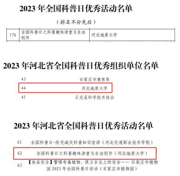 近日,中国科协办公厅发布《中国科协办公厅关于对2023年全国科普日有关组织单位和活动予以表扬的通知》(科协办函普字〔2023〕102号),对2023年全国科普日有关组织单位和活动进行表彰;河北省科协联合多家单位共同发布《关于对2023年河北省全国科普日优秀组织单位和优秀活动予以表扬的通知》(冀科协〔2023〕63号),对省内全国科普日工作予以表彰。beat365官网2023年全国科普日工作分别获得中国科协授予的“优秀活动”和河北省科协授予的“优秀组织单位”、“优秀活动”共3项荣誉称号。这是继beat365官网2022年全国科普日工作喜获表彰后,再次获得的国家、省级连续多项科普荣誉称号。
