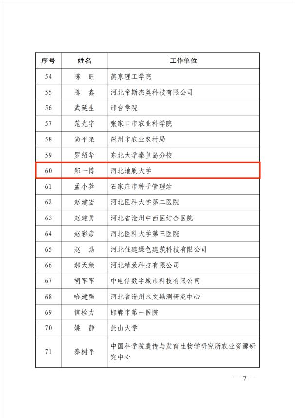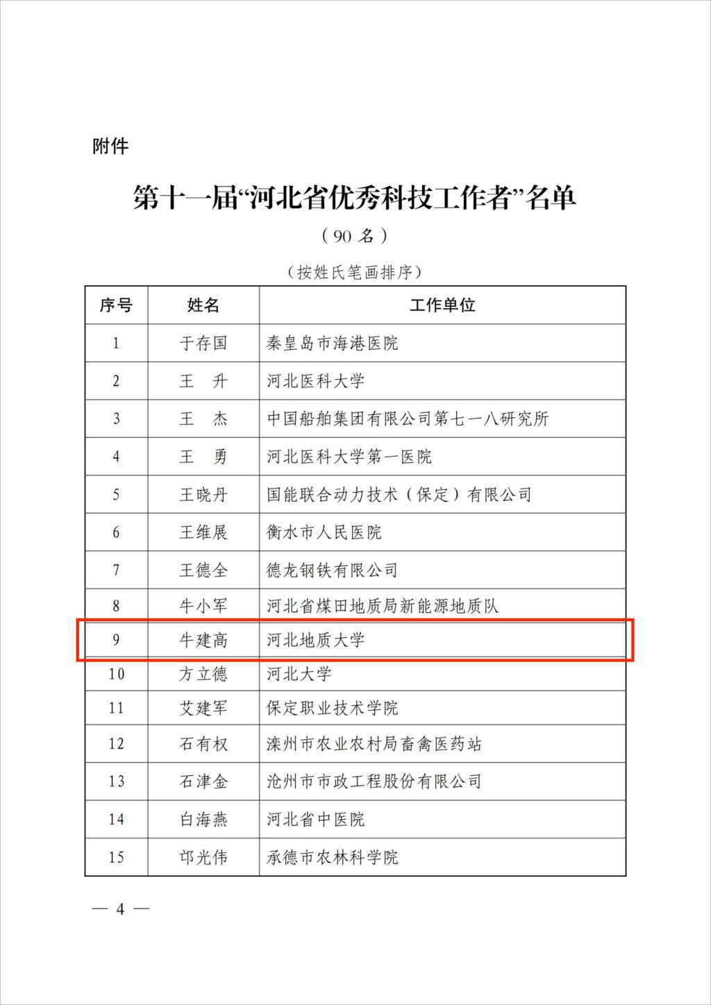 近日,中共河北省委组织部、河北省科学技术厅、河北省人力资源和社会保障厅、河北省科学技术协会联合下发《关于表彰第十一届“河北省优秀科技工作者”的决定》,beat365官网牛建高、郑一博、李杰、陆刚四名教师分别经河北省科学技术情报学会、河北省生物医学工程学会、河北省地质学会、河北省区域科学学会推荐参加评选,最终荣获第十一届“河北省优秀科技工作者”称号。