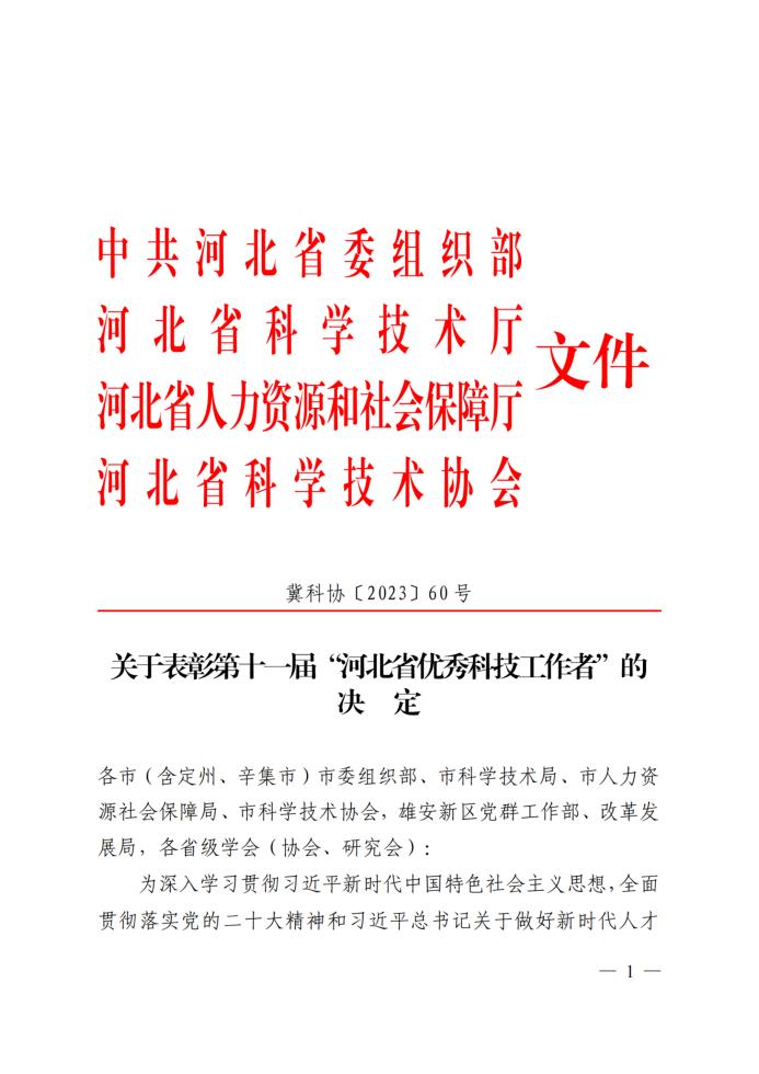 《关于表彰第十一届“河北省优秀科技工作者”的决定》指出,获得“河北省优秀科技工作者”称号的同志是全省广大科技工作者中的优秀代表,他们践行科学家精神,恪守科学道德,立足本职,敬业奉献,对促进我省科技进步和经济社会发展作出了积极贡献。希望受到表彰的优秀科技工作者,珍惜荣誉,再接再厉,求实奉献,再立新功。全省广大科技工作者要以受表彰的科技工作者为榜样,坚定爱国之心,砥砺爱国之志,主动肩负时代使命和责任担当,勇于创新,锐意进取,勇攀科技高峰,促进经济社会高质量发展,服务人民幸福生活,为奋力谱写中国式现代化建设河北篇章贡献力量。