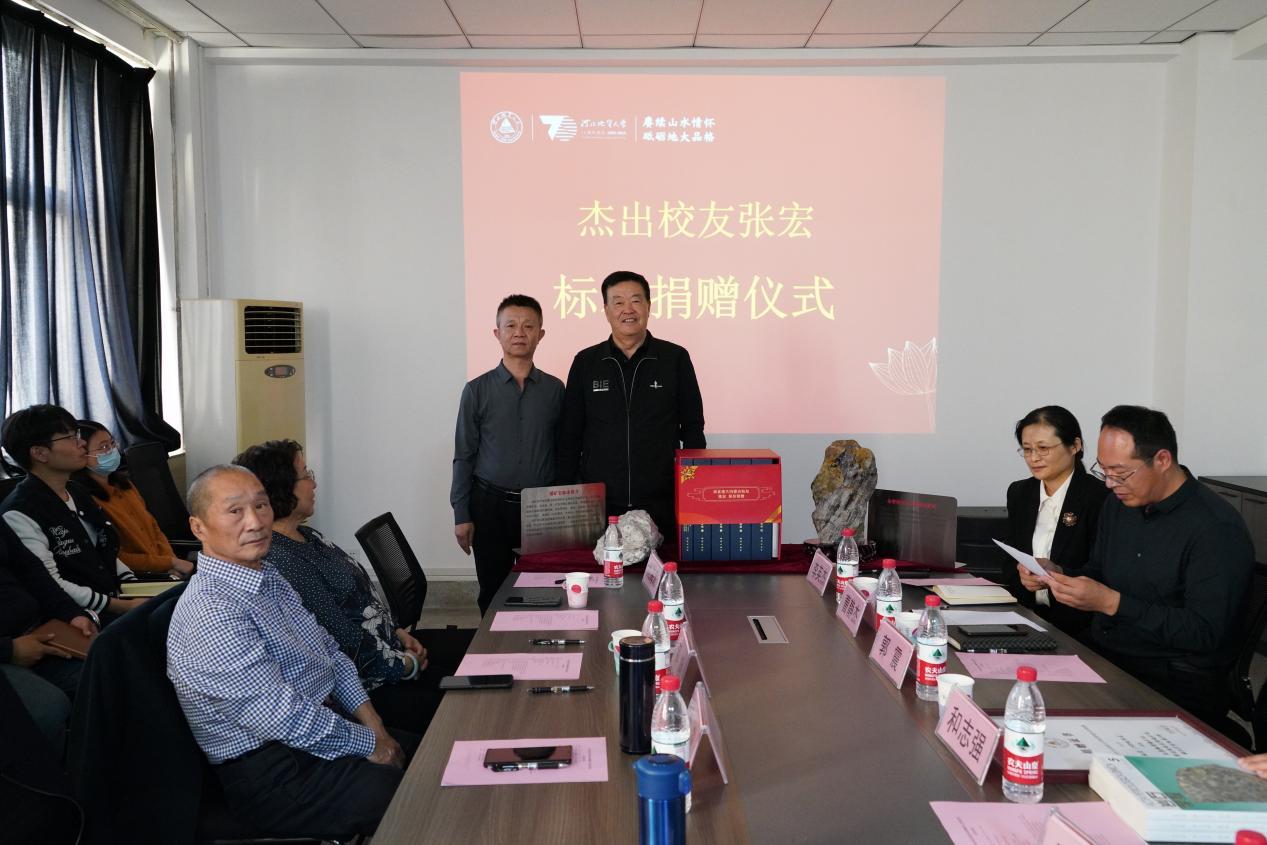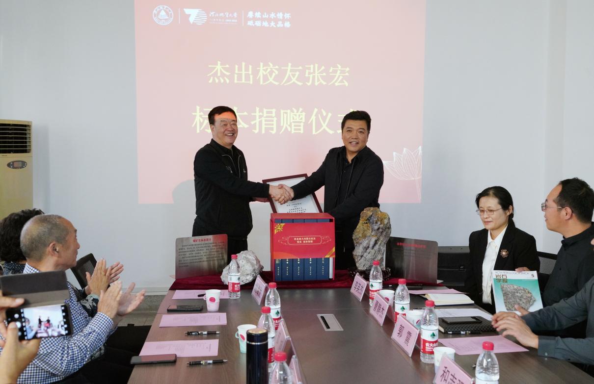 在捐赠仪式上,和志强代表beat365在线唯一官网登录全体师生,热烈欢迎各位校友在70周年之际回到母校,感谢校友对母校长期的支持。七十年来,beat365在线唯一官网登录承载了一代又一代校友的美好回忆,也见证了无数校友的辉煌成就。校友张宏捐赠了珍贵的条带状白云石型铁矿石和稀土矿石、新版内蒙古自治区矿产志。校友张宏详细介绍了矿石和矿产志的基本情况和重要性,这批捐赠的物品将为地球科学相关专业的教学和科研工作提供极大的帮助。郭震接收了捐赠物品,同时向校友表达了深深的感谢。和志强向张宏颁发了捐赠证书。