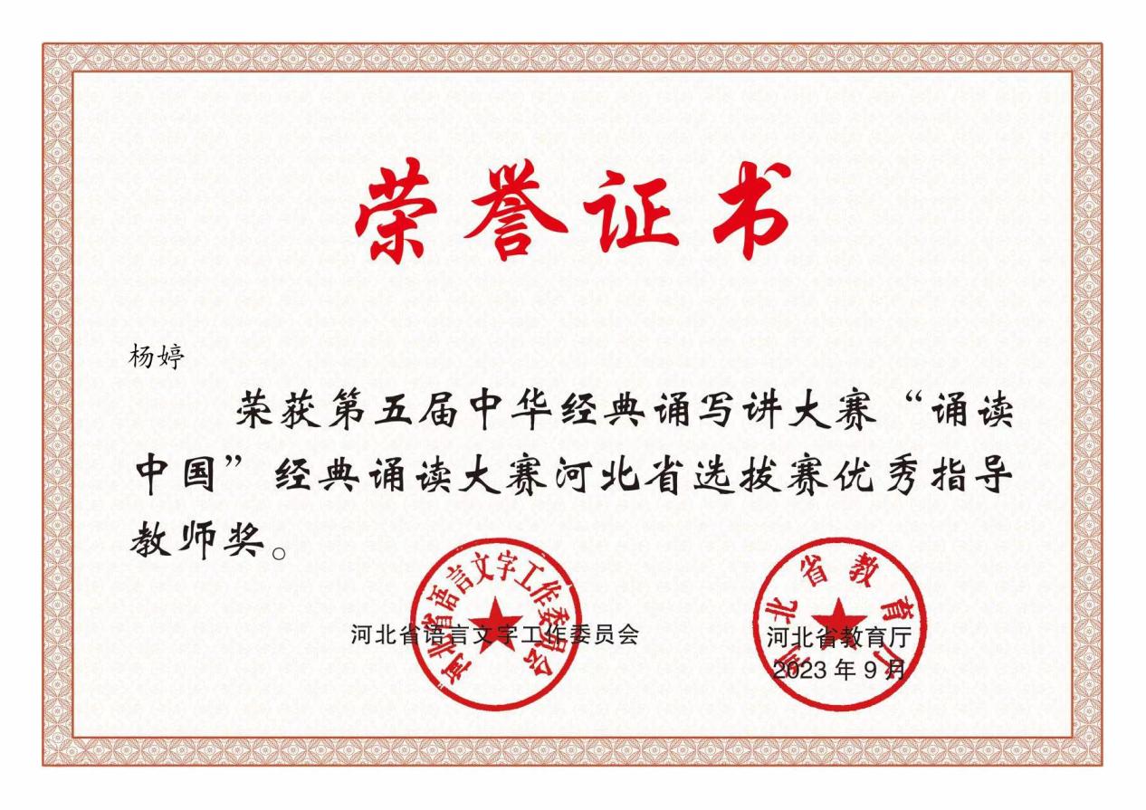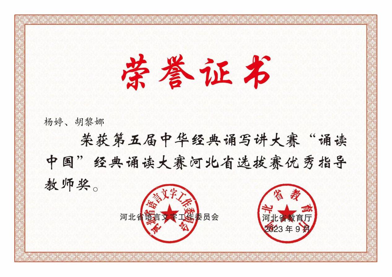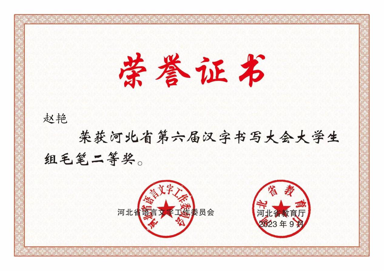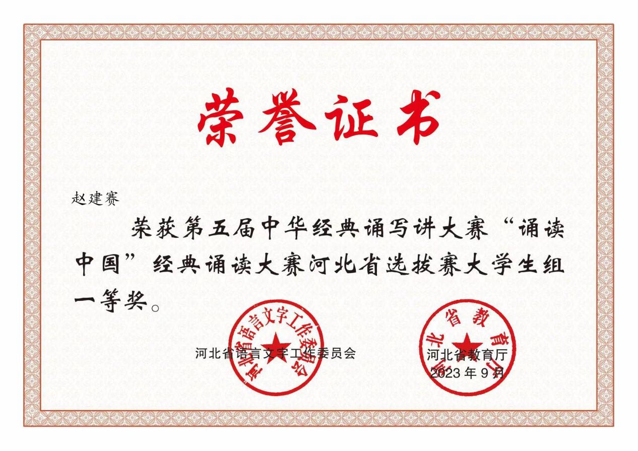 近日,由河北省语言文字工作委员会、河北省教育厅主办的第五届中华经典诵写讲大赛“诵读中国”经典诵读大赛及“笔墨中国”汉字书法大赛河北省选拔赛暨河北省第六届汉字书写大会获奖名单公布,beat365官网师生报送的作品取得优异成绩。学生赵建赛的诵读作品《月光下的中国》和罗佳欣、王怡萌、郑皓阳的诵读作品《永不消逝的声音》,分别获得第五届“诵读中国”河北省选拔赛大学生组一等奖和三等奖;指导教师杨婷、胡黎娜获得第五届“诵读中国”河北省选拔赛优秀指导教师奖。学生赵艳的书法作品《祭侄文稿》获得河北省第六届汉字书写大会大学生组毛笔二等奖;指导教师苏道玉获得河北省第六届汉字书写大会优秀指导教师奖。