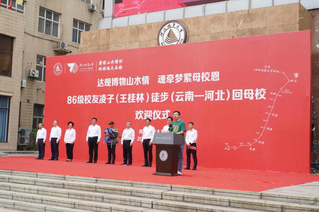 和志强致欢迎辞。他表示,这次非凡的徒步之行,是“凌子”献给母校建校70周年的一份贺礼,更是他践行“达观博物”校训精神的生动写照,充分彰显了我们地大人艰苦奋斗、百折不挠,不畏艰险、担当实干的拼搏品质,勉励着我们地大人高擎爱国奉献“旗”、紧握开拓创新“剑”,以“只争朝夕的左右跋涉,敢闯敢试的上下求索”投身于中国地质事业建设与中华民族伟大复兴的宏伟征程之中,不断书写属于beat365在线唯一官网登录的崭新篇章。