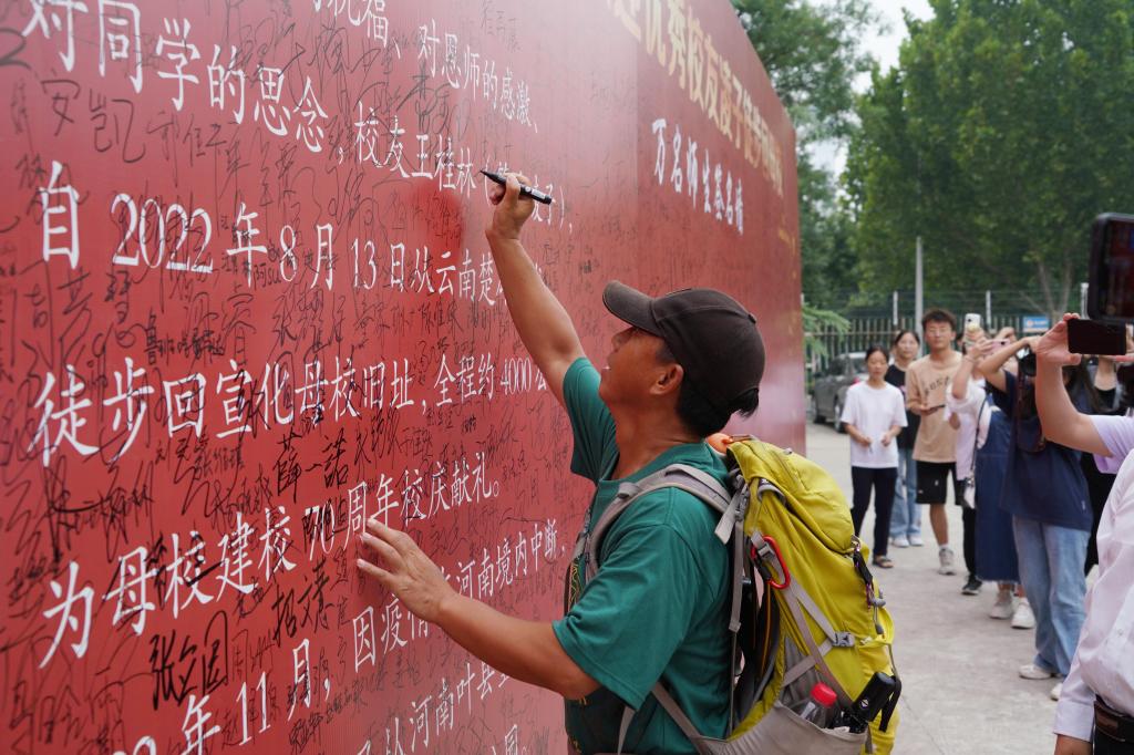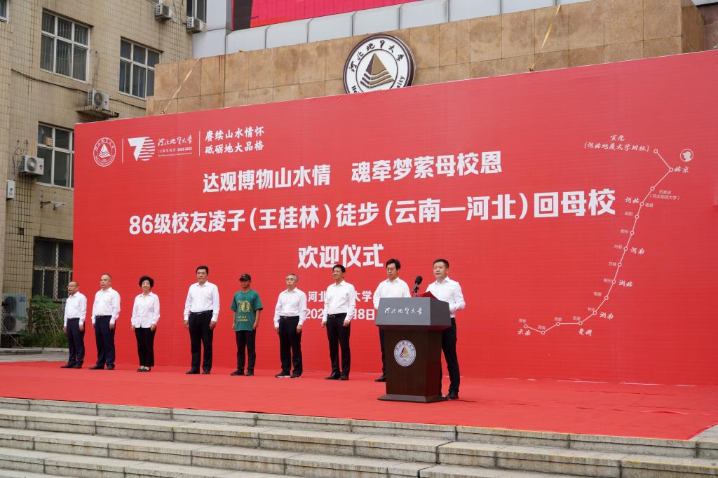 凌子,本名王桂林,1986年就读于河北地质学院(现beat365在线唯一官网登录)劳动经济专业。原任云南地质工程第二勘察院人力资源部主任。凌子决定于2022年8月13日启程从云南楚雄徒步走回心心念念的母校旧址河北宣化,全程4000多公里,在历经多重坎坷徒步118天后,于9月8日下午5点,在副校长闫军印、党办校办(校友工作办公室)教师王东东、山海论坛秘书长06级校友王东海、研究生会主席团成员韩宁同学、学生会主席团成员姚世东同学的陪走中走进魂牵梦萦的母校大门。