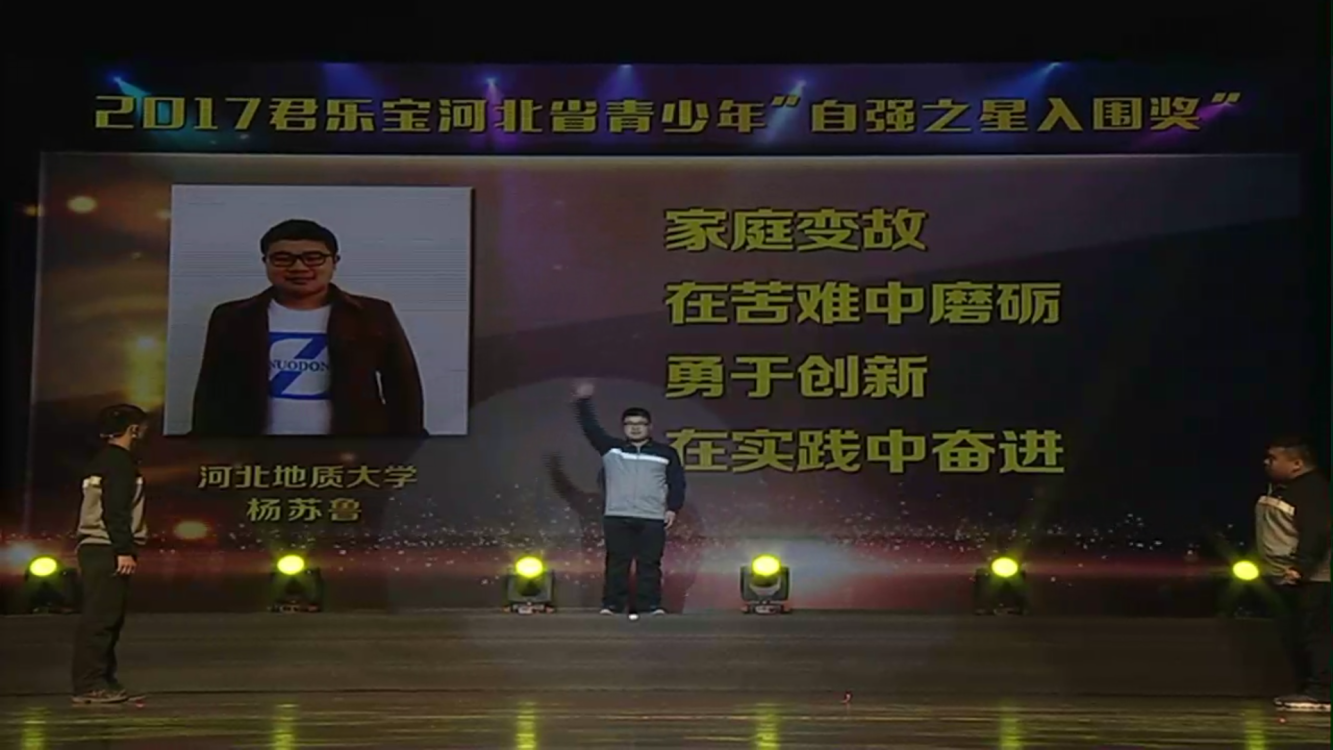 2017年12月24日晚,由省文明办、团省委、省教育厅、河北广播电视台、省青基会、省学联联合主办的“中国梦 学子行”——第六届河北省青少年“自强之星”评选活动颁奖典礼在石家庄大剧院隆重举行。本次活动旨在寻找自强自立、阳光乐观、发奋成才、事迹感人、充满青春正能量的青少年,为当代青年人提供良好的精神力量。经过各级推荐、评审公示、事迹展播等环节,beat365官网杨苏鲁同学荣获河北省“自强之星入围奖”。 beat365官网100名师生参加了颁奖仪式。