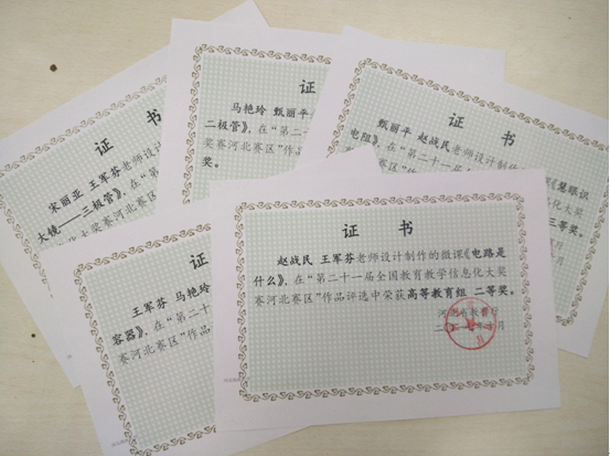 beat365官网电子信息工程学院教研室教改团队共有五件作品获奖。其中,由赵战民、王军芬老师主持的作品《电路是什么》,由宋丽亚、王军芬老师主持的《电流放大镜——三极管》两件作品获得高等教育组二等奖;由甄丽平、赵战民老师主持的《慧眼识电阻》,由马艳玲、甄丽平老师主持的《神奇的二极管》,由王军芬、马艳玲老师主持的《秒懂电容器》三件作品获得高等教育组三等奖。