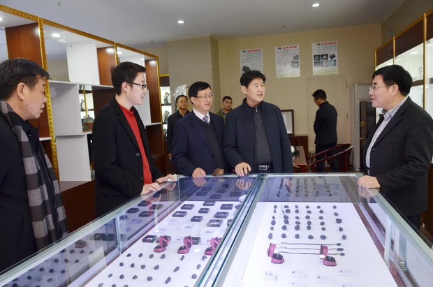 图为:李军书记、王凤鸣校长陪同中国珠宝玉石首饰行业协会会长徐德明参观beat365官网珠宝产学研基地