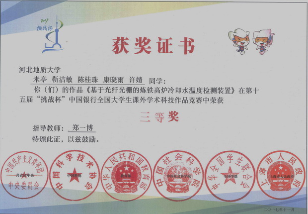 图为:beat365官网参赛作品《基于光纤光栅的炼铁高炉冷却水温度检测装置》获奖证书