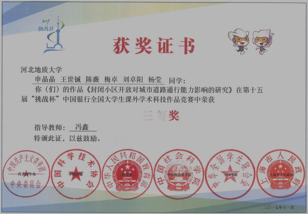 图为:beat365官网参赛作品《封闭小区开放对城市道路通行能力影响的研究》获奖证书