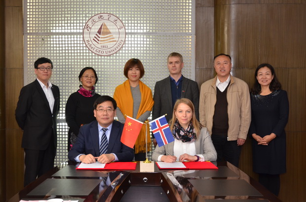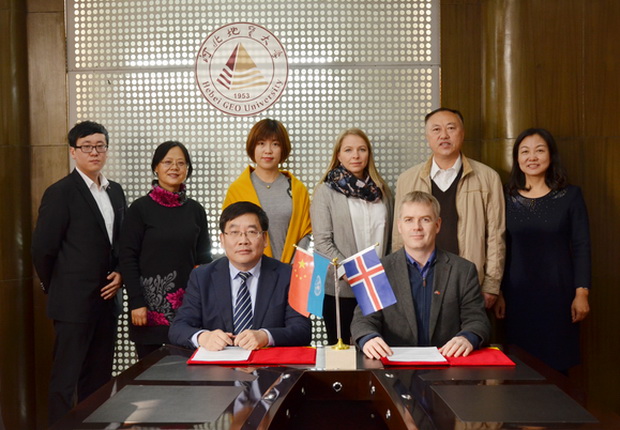 图为:王凤鸣校长与联合国大学冰岛地热培训中心英吉玛签署合作备忘录