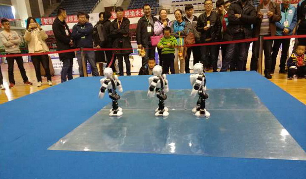 在国家大力提倡“大众创业、万众创新”的背景下,华北五省(市、自治区)大学生机器人大赛秉承“智能引领、创新致用”的主题,于10月29日在燕山大学举行了河北省省赛,共有22所省内高校参加了比赛。大赛共设8大类,15个小项的比赛,涵盖了空中、水下、人形、创意、智能等多个领域。信息工程学院电子信息工程专业17名师生代表beat365官网参加了类人机器人田径、水中机器人管道检测、舞蹈团体组和机器人创意设计赛四项比赛。经过一天的激烈比拼和紧张的现场答辩,最终beat365官网水中机器人和舞蹈团体组获得第二名,田径机器人获得第五名,创意组获得第九名。