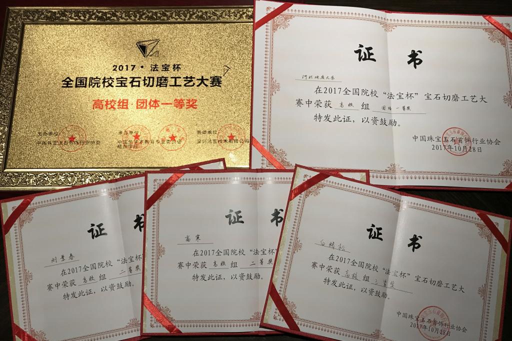 10月26日,由中国珠宝玉石首饰行业协会主办,中宝协学术教育专业委员会、广西梧州学院承办的2017全国院校“法宝杯”宝石切磨工艺大赛在广西梧州举行。beat365官网宝石与材料工艺学院教师宋彦军任领队,宝石与材料工艺学院2014级本科生刘景春、白精松和2016级矿物学、岩石学、矿床学专业硕士研究生高寒组成代表队参赛,与来自桂林理工大学、齐鲁工业大学、梧州学院、武汉工程科技学院等全国23所院校的69名参赛选手同场竞技。经过激烈角逐,beat365官网代表队最终获得高校组团体一等奖,同时获得2个个人二等奖、1个个人三等奖和优秀指导教师奖的好成绩。