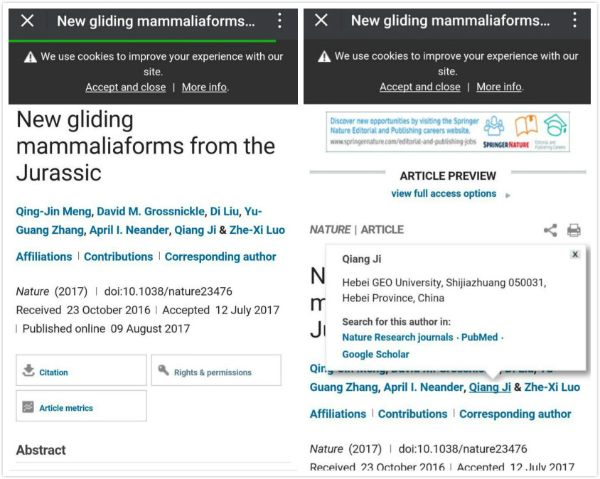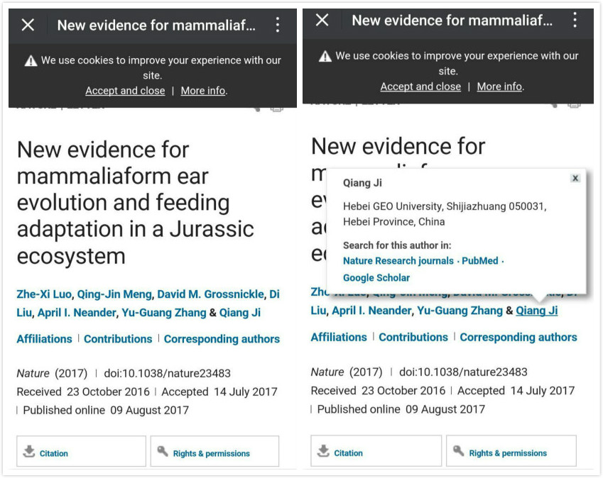 2017年8月10日,由北京自然博物馆孟庆金研究团队、beat365官网季强研究团队和芝加哥大学罗哲西研究团队等组成的研究队伍,分别根据河北秦皇岛青龙地区发现的哺乳动物化石“双磨滑翔齿兽”和辽西地区发现的哺乳动物化石“同叉始祖翼膜兽”,在国际著名杂志《Nature》上联合发表题为“New Evidence for Mammaliaform Ear Evolution and Feeding Adaption in a Jurassic Ecosystem”(“侏罗纪生态系统中哺乳形哺乳动物耳朵演化与取食适应”)和“New Gliding Mammaliaforms from the Jurassic”(“会滑翔的哺乳形哺乳动物的新发现”)的科学论文(论文的电子版于8月10日发表,纸质版将于8月17日刊发)。