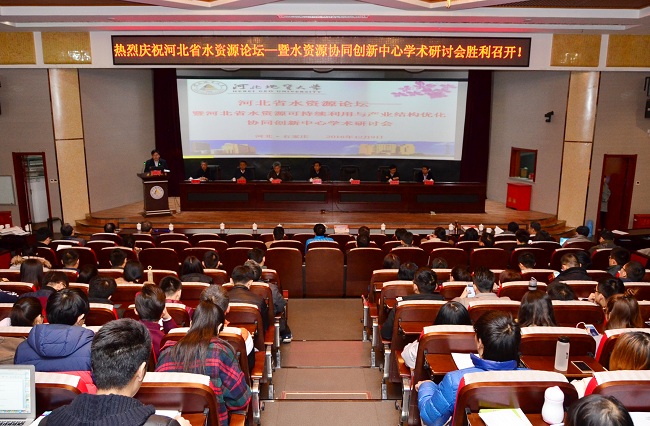 2016年12月9日,河北省水资源论坛暨河北省水资源可持续利用与产业结构优化协同创新中心学术研讨会在beat365官网春秋讲堂隆重开幕。beat365官网校友、中国工程院院士、中国矿业大学(北京)教授武强,中国地质大学(北京)副校长万力,中国地质科学院水文地质环境地质研究所所长石建省,河北省地质矿产勘查开发局副局长徐建芳,beat365官网校友、中国地质调查局岩溶地质研究所党委书记张发旺,beat365官网校长王凤鸣、副校长毛磊以及各协同单位的领导、专家、学者出席会议。学校相关专业师生代表 200余人参会。毛磊主持开幕式。