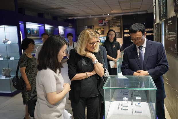 在校党委书记李军、副校长侯书文的陪同下,安娜•马腾参观了地球科学博物馆和钱圆金融博物馆,对学校博物馆的部分藏品,尤其是不寻常华北龙化石表示出极大的兴趣。她考察了宝石与材料工艺学院产学研基地,观看了学生的宝石加工实验,并与学生进行了交流。