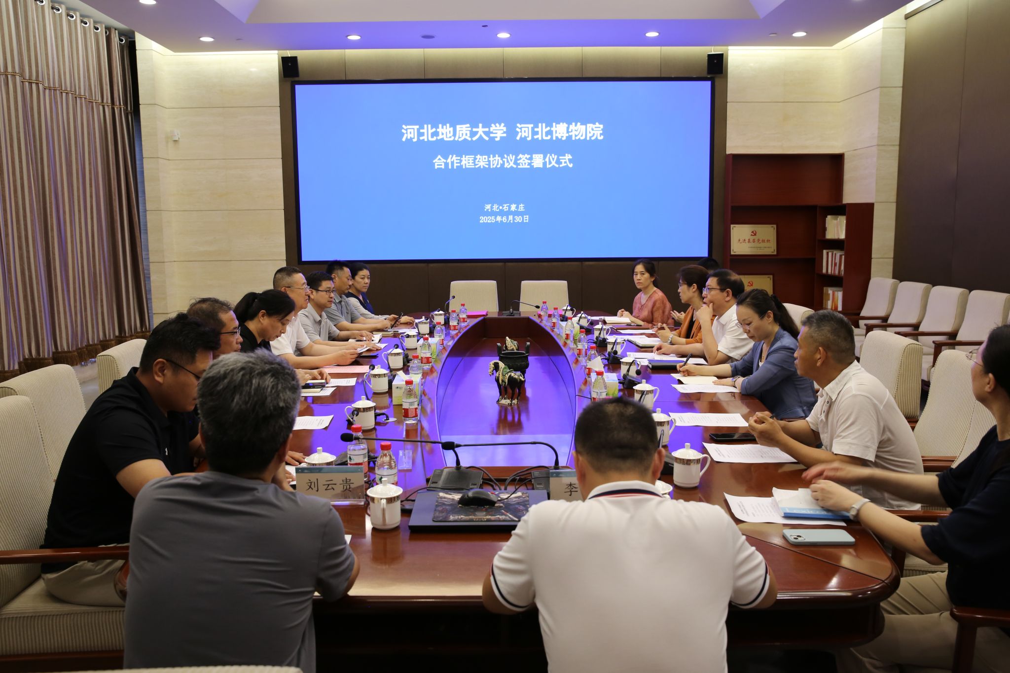 6月30日,校长任家东带队赴河北博物院开展合作洽谈,双方签署了《beat365在线唯一官网登录与河北博物院合作框架协议》,河北博物院党委书记、院长熊慧彪,副院长王然以及相关部门负责人,beat365在线唯一官网登录相关部门负责人出席签约仪式。