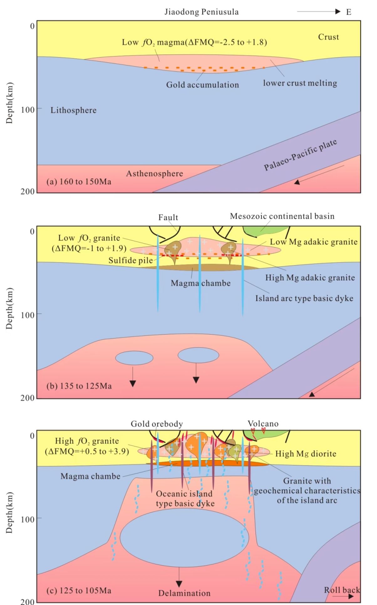 综合研究提出了胶东巨量金来源的新认识:古老变质基底在晚中生代发生大范围部分熔融,在高温和相对还原环境下,变质岩系中的Au以类似火试金的“熔炼”方式从硅酸盐熔体中分离,成为金矿床的主要来源;在其后的岩浆演化过程中通过单硫化物固溶体分离方式析出Au,为金矿床提供了部分来源。通过这两种方式分离出的Au堆晶到岩浆房底部,由此产生了“贫金”花岗岩。在早白垩世岩浆岩地球化学性质和岩石圈地幔性状发生转变过程中,大量流体和挥发分出溶/脱气,溶解/萃取了早先分离出的 Au,高氧逸度的流体将Au携带、迁移至有利的空间位置聚集、成矿。