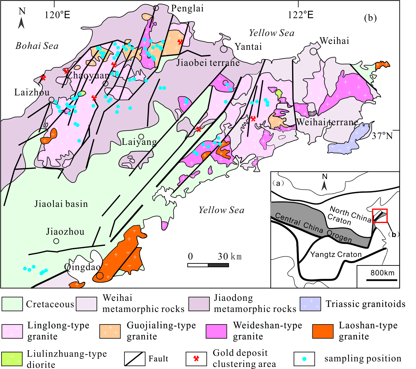 图1 胶东地区区域地质和采样位置图