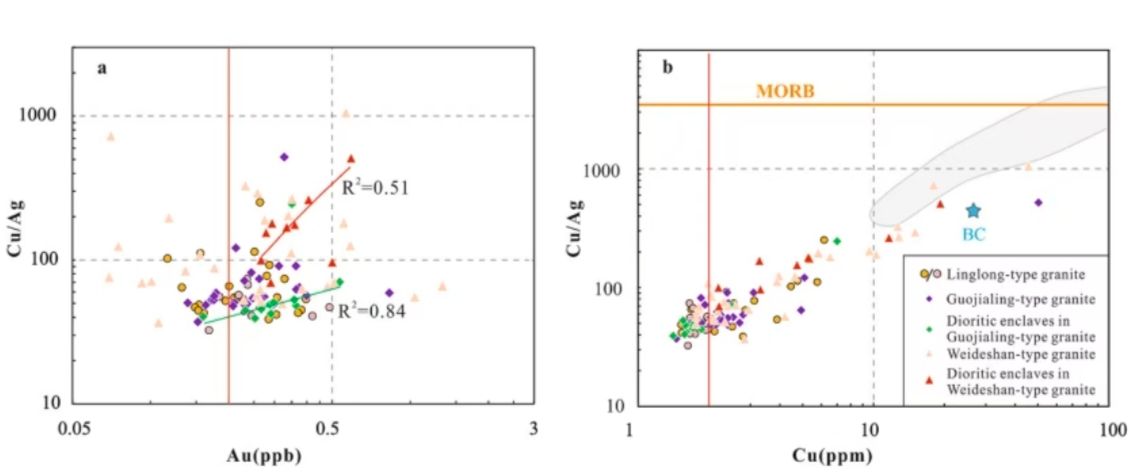 样品测试结果表明:早前寒武纪变质岩、晚中生代侵入岩和白垩纪火山岩的Au平均含量分别是0.65ppb、0.29ppb和0.28ppb;晚中生代侵入岩的Ag、Cu、Pb、Zn、As、Sb元素平均含量分别是38.4ppb、4.11ppm、28.9ppm、57.6ppm、0.83ppm和0.09ppm。对测试数据的分析发现,胶东半岛与金成矿相关地质单元中Au的含量普遍较低,低于地壳丰度值。但早前寒武纪变质岩中Au的含量是晚中生代花岗岩中的2倍以上,晚中生代花岗岩具有明显的“贫金”特征。郭家岭型花岗岩的Cu/Ag比值与Au含量之间具有弱的正相关,闪长质包体的Cu/Ag与Au含量呈较好的正相关;晚中生代花岗岩及闪长质包体的Cu/Ag与Cu含量呈正相关关系。