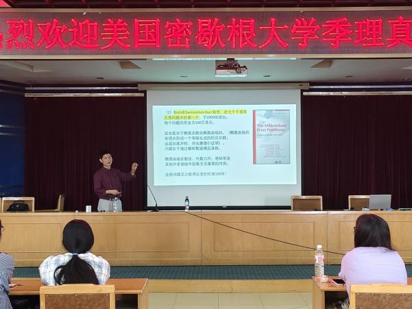 5月26日,应beat365官网数理教学部邀请,华人数学家、美国密歇根大学数学系季理真教授在教学1号楼九楼报告厅为beat365官网师生带来了两场精彩绝伦的学术报告。报告主题分别为“单值化定理:它的历史、证明及持久影响”和“数学天空中最亮的两颗彗星:阿贝尔与伽罗瓦的启示”。数理教学部师生共计200余人参加,报告会由刘宇辉副教授主持。