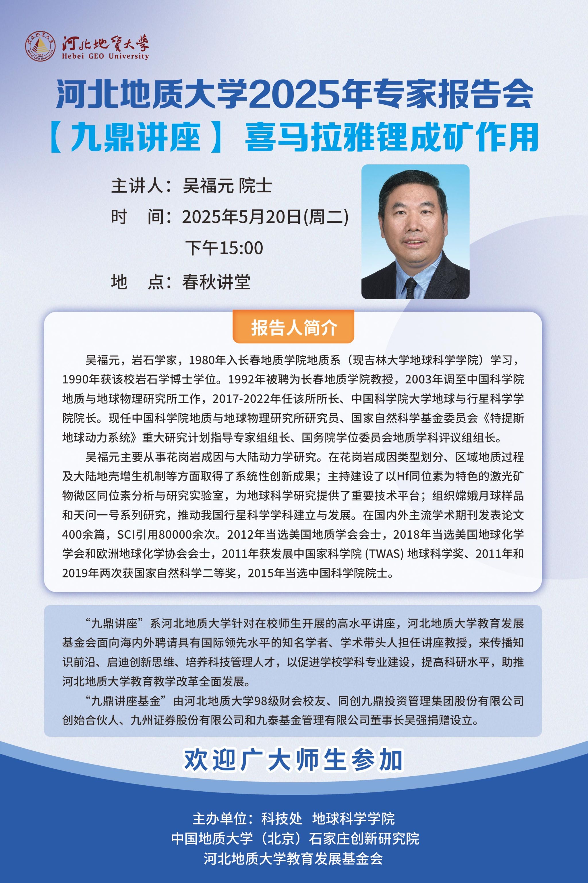 【专家河北行信息预告】“九鼎讲座”系列学术报告 岩石学家吴福元院士学术报告会:喜马拉雅锂成矿作用