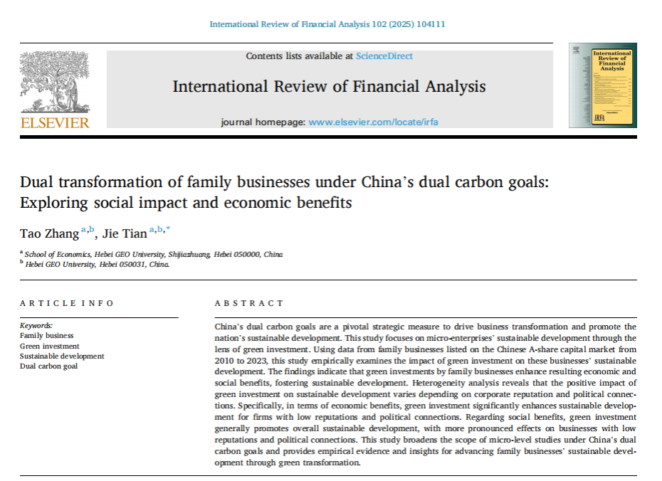 近日,学校经济学院田杰副教授与硕士研究生仉涛合作论文《Dual transformation of family businesses under China's dual carbon goals: Exploring social impact and economic benefits》于《International Review of Financial Analysis》发表。