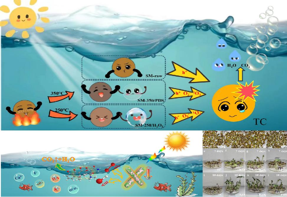 第一项研究中,受环境地质中的沉积物中含有Al2O3、Fe2O3与TiO2等催化活性物质的启发,通过高温煅烧对沉积物改性,既分解了其自身吸附的有机污染物,又保留了对四环素的高效的吸附性能与催化性能,其中350℃煅烧的沉积物与250℃煅烧的沉积物能够高效活化过二硫酸盐与H2O2,对四环素的去除率能够达到94.7%和95.7%;第二项研究中,利用水热法制备了具有0D/1D BiVO4/CuBi2O4Z-scheme异质结,在90分钟内通过光热辅助催化体系实现了对天然水体中四环素污染85.0%去除率。通过LC-MS确定了降解四环素产生的中间产物,并结合生物毒性实验与ECOSAR软件模拟探索了毒性削减机制。以上成果通过“以废治废”的策略,解决了沉积物污染的问题,并结合了环境功能材料特殊形貌结构、氧化还原能力和光热效应的优势,为环境功能材料的实际应用提供了新的研究思路,对天然水体中新污染物高效去除的新路径进行了探索。