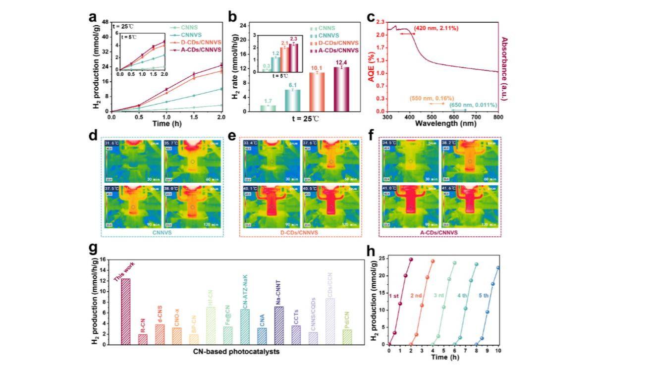 图2 所制备的光催化剂在5 ℃和25 ℃下的 (a) 时间依赖制氢曲线和 (b) 析H2速率;(c) 环境温度(25 ℃)下A-CDs/CNNVS的表观量子效率(AQE)值;(d) CNNVS、(e) D-CDs/CNNVS和 (f) A-CDs/CNNVS样品在全光谱照射下的光热红外温度映射图像;(g) 近年来制氢性能对比;(h) A-CDs/CNNVS的循环稳定性实验