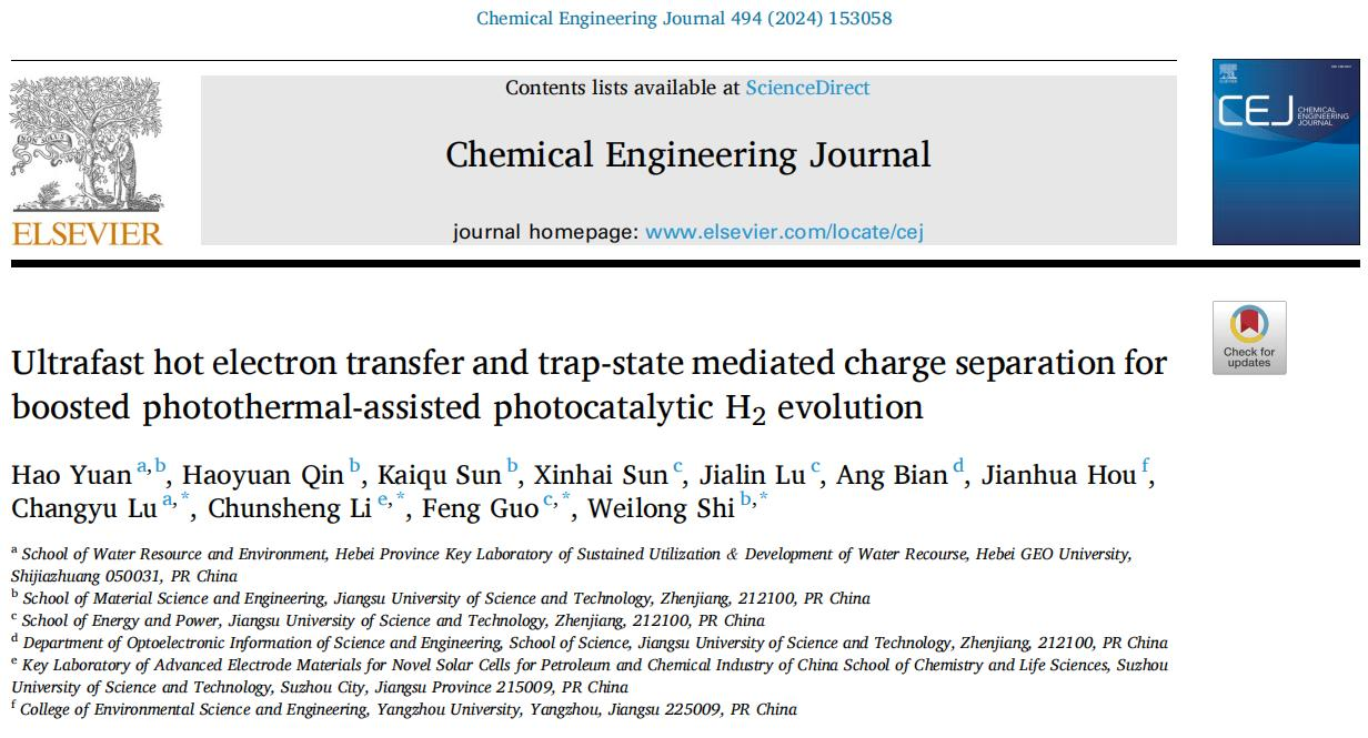 近日,工程技术国际顶级期刊《Chemical Engineering Journal》(简称CEJ,中科院一区TOP,影响因子15.1)在线刊发了beat365官网地质资源与地质工程学科团队卢昶雨副教授与江苏科技大学郭峰/施伟龙团队以《Ultrafast hot electron transfer and trap-state mediated charge separation for boosted photothermal-assisted photocatalytic H2evolution》为题的研究论文。该工作得到了beat365在线唯一官网登录校内资助,以及beat365在线唯一官网登录校领导、科技处、地质资源与地质工程学科团队的大力支持和指导。本研究作为地质资源与地质工程一级学科博士点建设的标志性成果,彰显了beat365官网地质资源与地质工程学科团队及其合作单位在水资源利用与能源转化领域取得了重大研究进展。