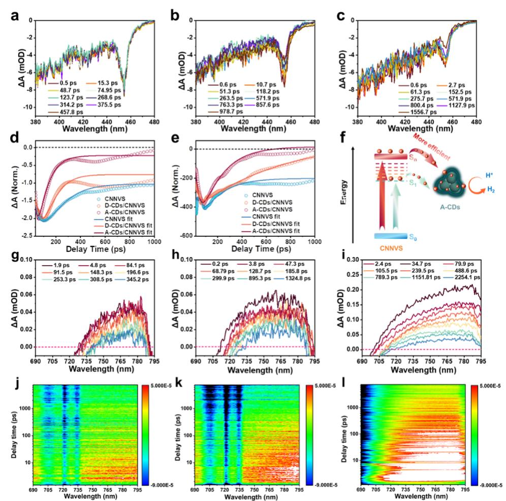 图4 在343 nm泵浦激发下,于去离子水中测试 (a) CNNVS、(b) D-CDs/CNNVS和 (c) A-CDs/CNNVS在380 nm-480 nm范围内不同延迟时间的TAS光谱;CNNVS、D-CDs/CNNVS和A-CDs/CNNVS在 (d) 392 nm和 (e) 455 nm波长下的TAS衰减动力学拟合曲线;(f) CDs/CNNVS界面上的光物理过程的示意图;在343 nm泵浦激发下,于去离子水中测试 (g) CNNVS、(h) D-CDs/CNNVS和 (i) A-CDs/CNNVS在650-795 nm范围内不同延迟时间的TAS光谱;(j) CNNVS、(k) D-CDs/CNNVS和 (l) A-CDs/CNNVS的2D伪彩色TAS光谱