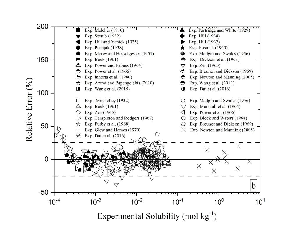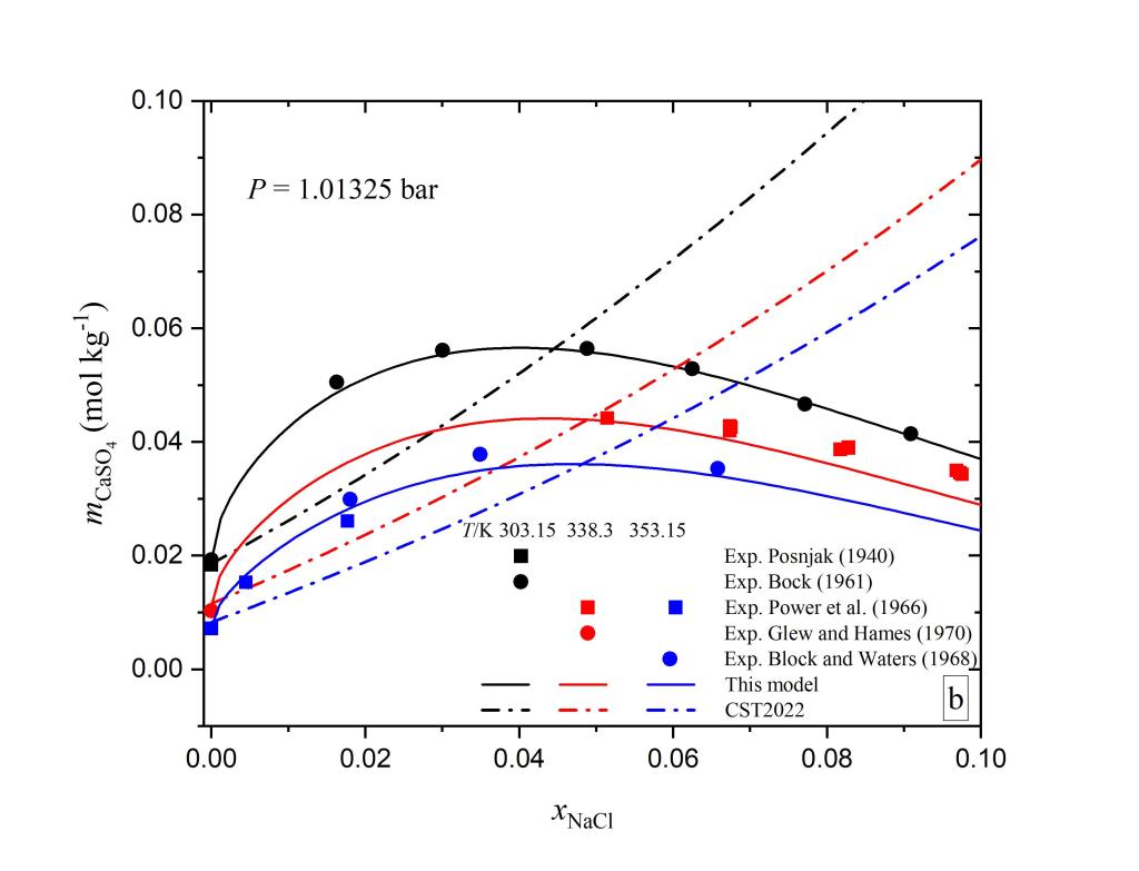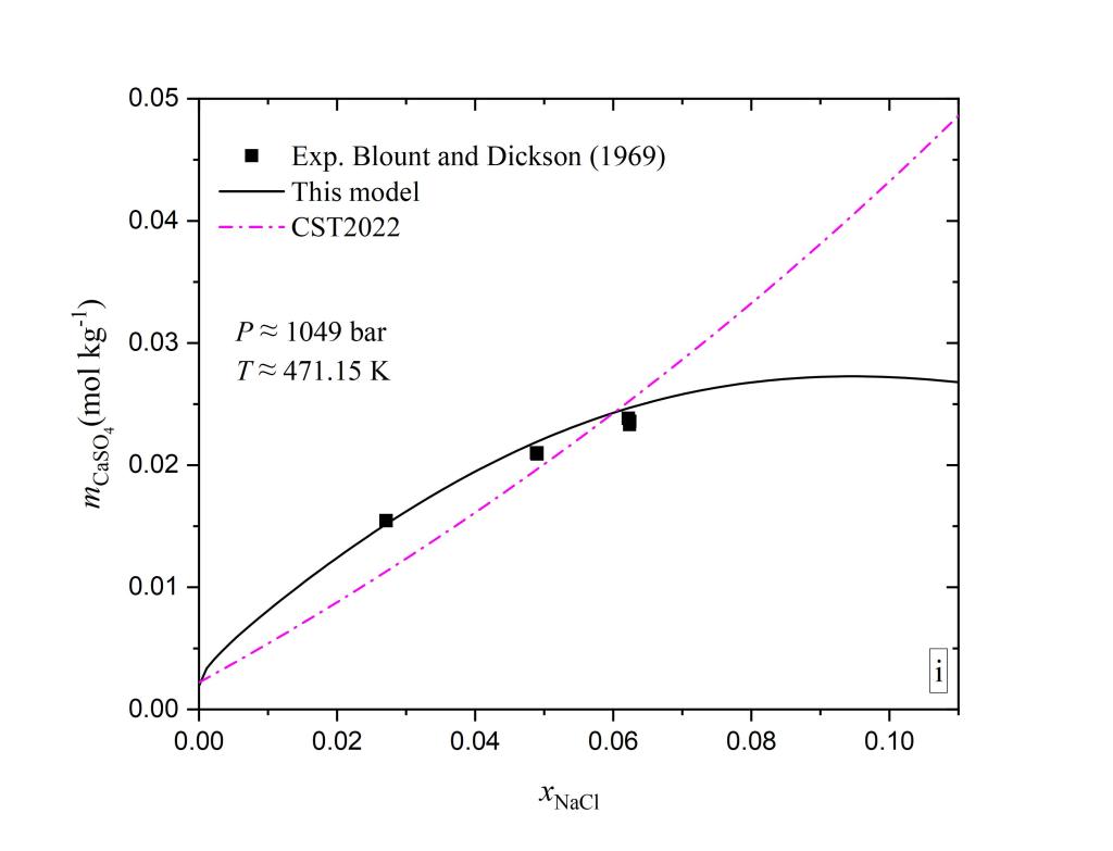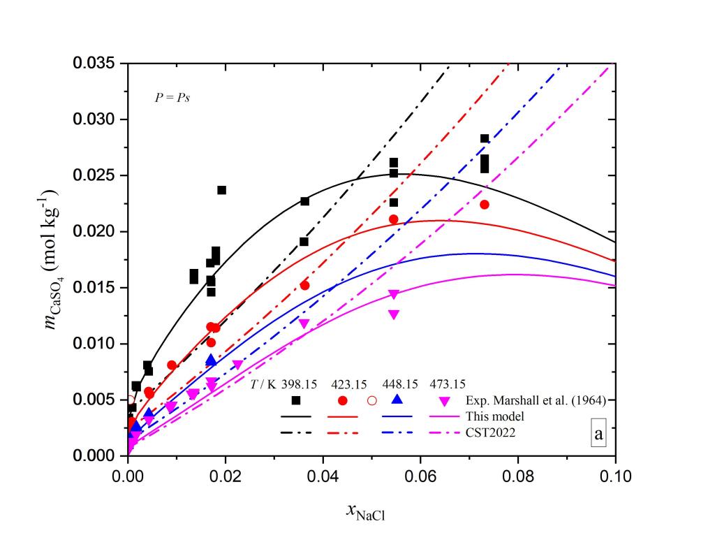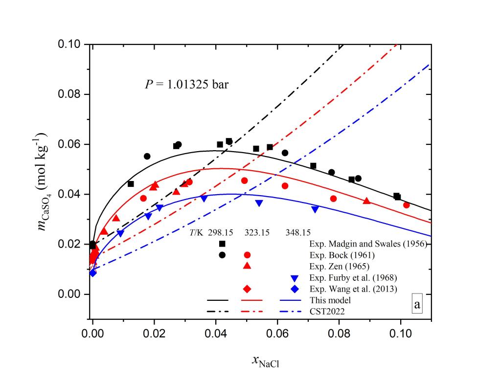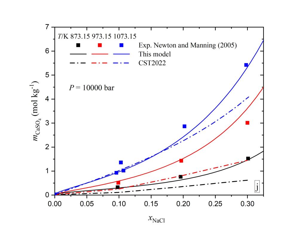 硬石膏矿物溶解度的研究在热液型矿床成矿规律、地热能源利用、CO2强化采油、湿法冶金、海水淡化等领域都具有非常重要的意义。高温高压条件下矿物溶解度的精确实验测量需要耗费大量物力和人力,现有的实验数据不论从精度上还是数量上都不完全能满足地球科学和相关工业研究的需要。适用范围宽、预测精度高的溶解度模型可以在人们感兴趣的物理化学条件下生成模拟数据。目前已有的硬石膏溶解度模型(Creaser, 2022, 图中表示为CST2022)与实验事实相比差距较大。与其它模型相比,本模型在宽广温度压力盐度范围内都具有更好的预测效果(部分图片如下)。