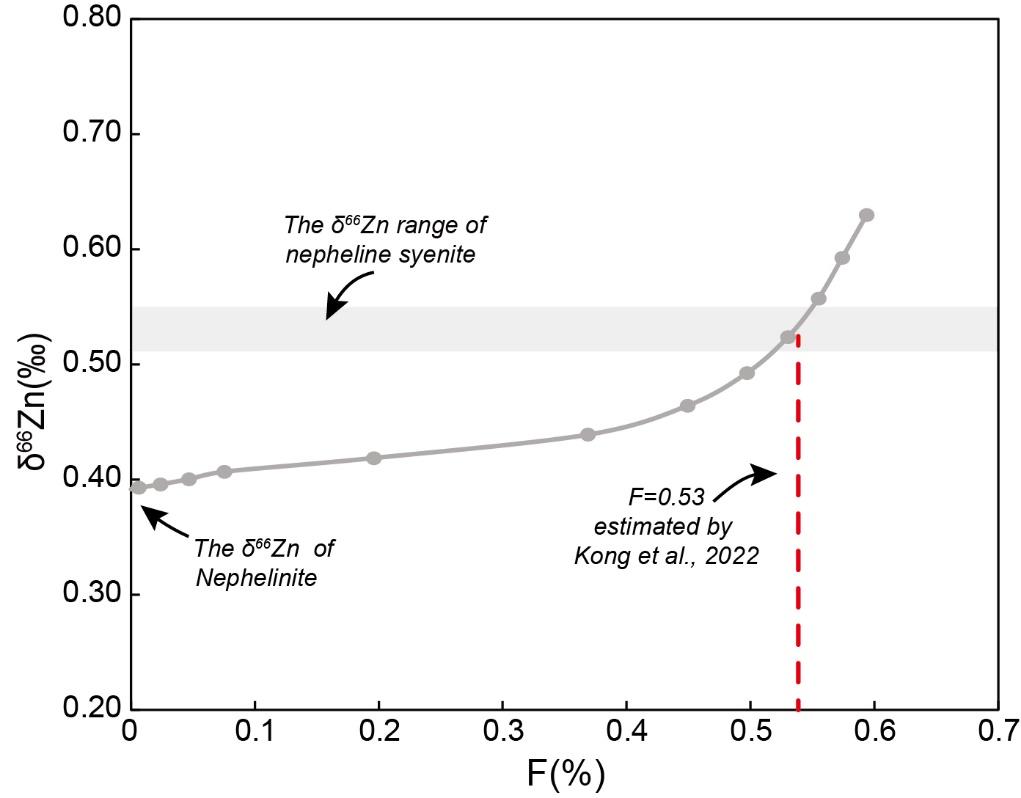 图7依据瑞利分馏模型计算的霞石质原始熔体到霞石正长岩分离结晶过程中δ66Zn与F(结晶程度,%)的关系