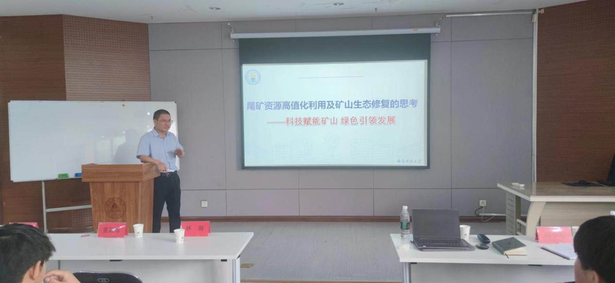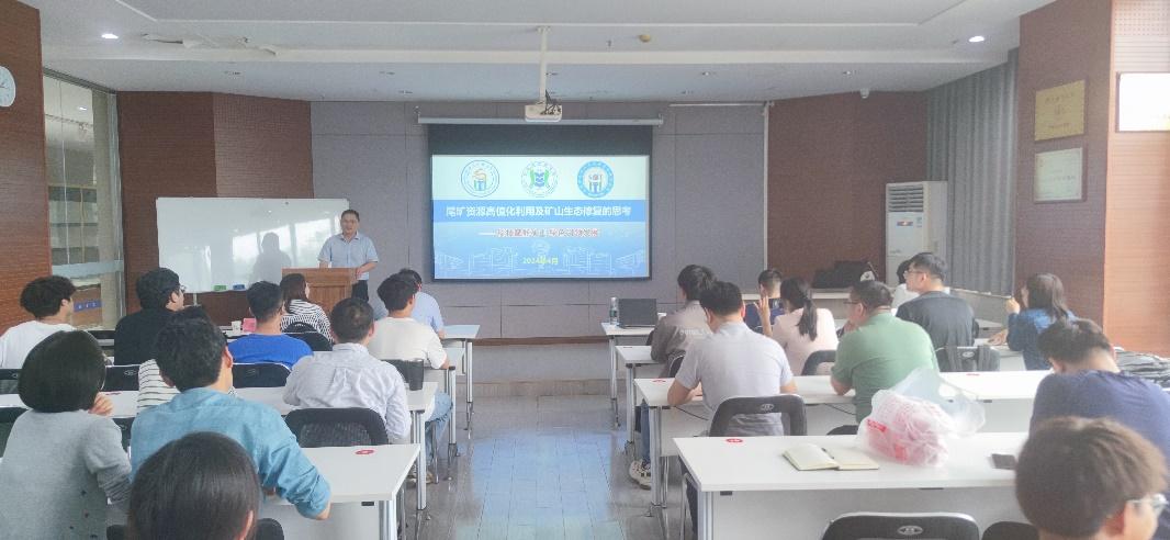 傅开彬教授首先介绍了西南科技大学环境与资源学院以及固废处理及矿山修复科研平台的发展历史和建设情况。随后,结合全国尾矿存量情况、尾矿资源化利用行业发展现状以及最新的政策法规,对尾矿资源化高值化利用和矿山生态修复进行了详细的分析,并以自身科研经历为例,深入讲解了尾矿微生物浸出技术及其转化成果。参会师生对报告内容展现出强烈的兴趣,傅开彬教授与师生开展了交流。