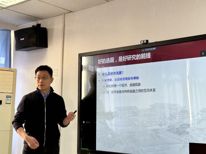 王勋首先以“国际金融的‘不可能三角’”为引入,提出“经济学研究的‘不可能三角’”,围绕什么是好的选题、如何找到好的选题、如何执行研究三个核心问题展开,讲述了如何做好经济学研究;其次,以金融抑制与经济增长、资本项目开放与创新、金融市场与异质性创新、外汇储备积累与企业创新、国企在负面冲击中的作用五个研究为例,具体交流了高水平论文选题的选择与写作;再次,以国内期刊和自身研究为例,强调要重视期刊的偏好与导向型,尤其是中央关心的热点问题、经济社会中新发展与新情况、规范的方法和颗粒度更高的微观数据;最后,从研究问题、重要性、可行性、预期的结论、政策含义等方面总结了如何做好经济学研究。会后,与会教师与王勋围绕经济学论文的写作、中介模型的使用、变量的测算等问题进行了探讨。此次学术讲座极具学理性和感染力,使与会师生受益匪浅,并对我们如何提高经济学论文写作能力提供了新思路和新方法。