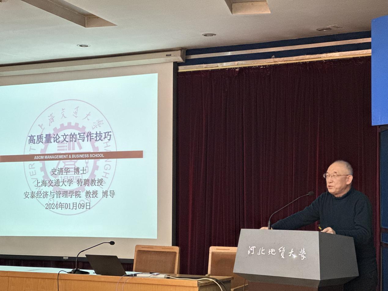 2024年1月8日,上海交通大学特聘教授,安泰经济与管理学院二级教授、博士生导师史清华应邀在一号教学楼9楼报告厅为经济学院师生作了题为“如何写一篇高质量论文”的学术讲座。本场讲座是beat365官网“九鼎讲座”系列讲座之一,由beat365在线唯一官网登录教育发展基金会“九鼎讲座基金”赞助。讲座由经济学院院长牛建高教授主持,经济学院教师及研究生参加了讲座。