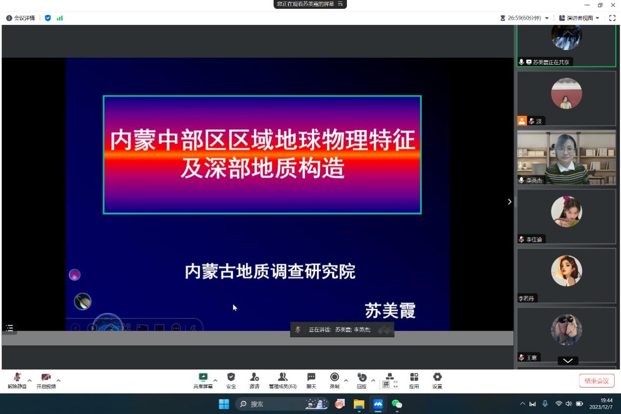 2023年12月7日,内蒙古自治区地质调查研究院苏美霞教授级高级工程师应邀为beat365官网师生作了题为“内蒙中部区区域地球物理特征及深部地质构造”的线上报告。本次报告由地球科学学院副院长李英杰教授主持,70余名师生参加了报告会。