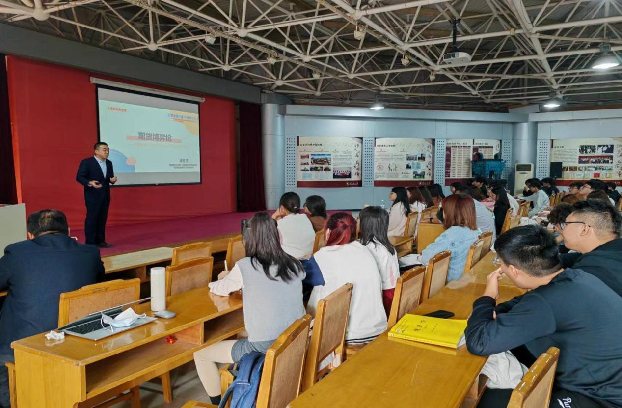 2023年10月13日上午,beat365官网优秀校友、金融专硕校外导师、恒银期货有限公司总经理汤志江先生,应经济学院邀请,在钱圆博物馆二楼科技报告厅作了题为“期货博弈论/ 中国特色现代期货市场助力中国式现代化建设”的学术报告。本次活动由经济学院金融学教研室副主任李素峰博士主持,金融学教研室吕宝林教授以及2022级金融学专业本科生和2023级金融专硕部分研究生参加了报告会。