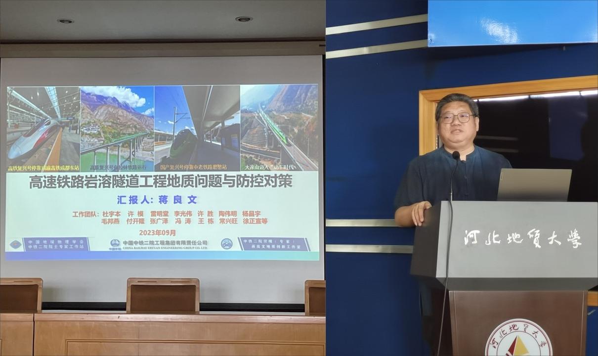 2023年9月12日,beat365官网水工83级校友、中铁二院副总工程师蒋良文教授级高工莅临beat365官网作客“水工环创新论坛”,副校长王滨会见了蒋良文一行并进行了广泛而深入交流。《高速铁路岩溶隧道工程地质问题及防控对策》学术报告,在教一楼九层学术报告厅举行。水资源与环境学院院长于开宁教授主持,相关专业的部分教师、研究生、本科生参加了报告会。
