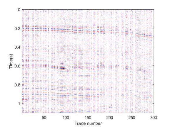 图4. 含噪实际数据:(a)原始数据;(b)60%随机采样数据。