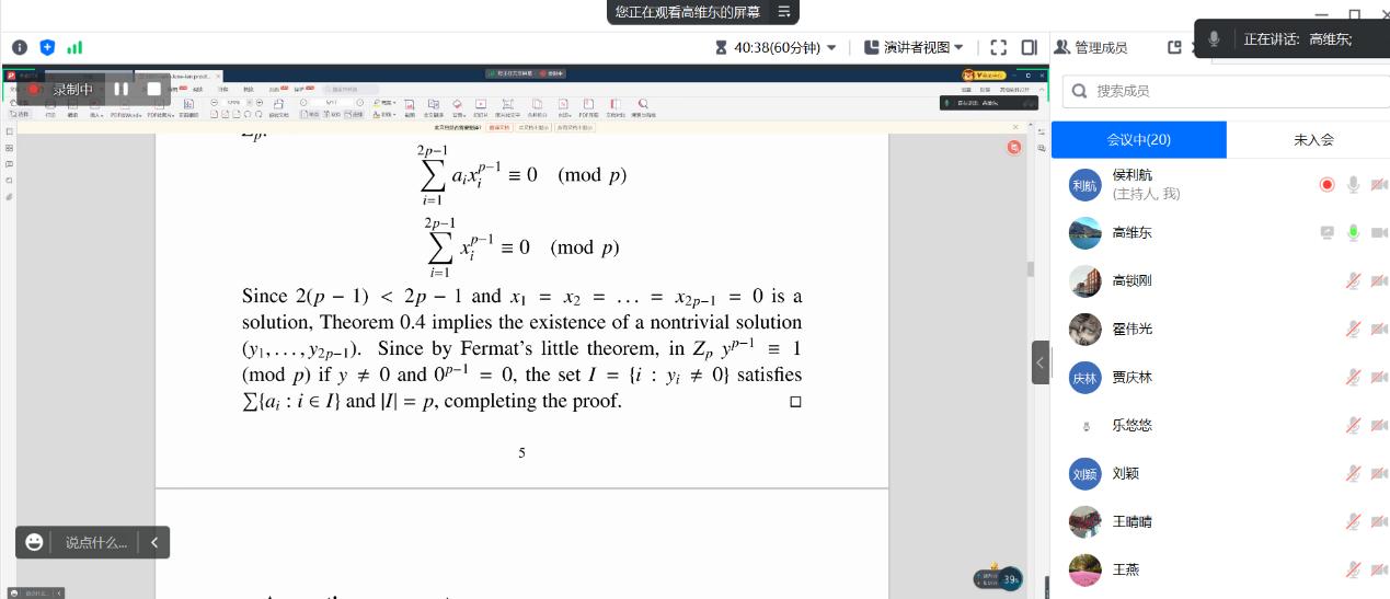 2023年6月12日,数理教学部邀请天津大学高维东教授为beat365官网师生作了题为《Erdos-Ginzburg-Ziv定理的十个证明》的线上学术报告。数理教学部部分教师和全体研究生参加了学术报告会。